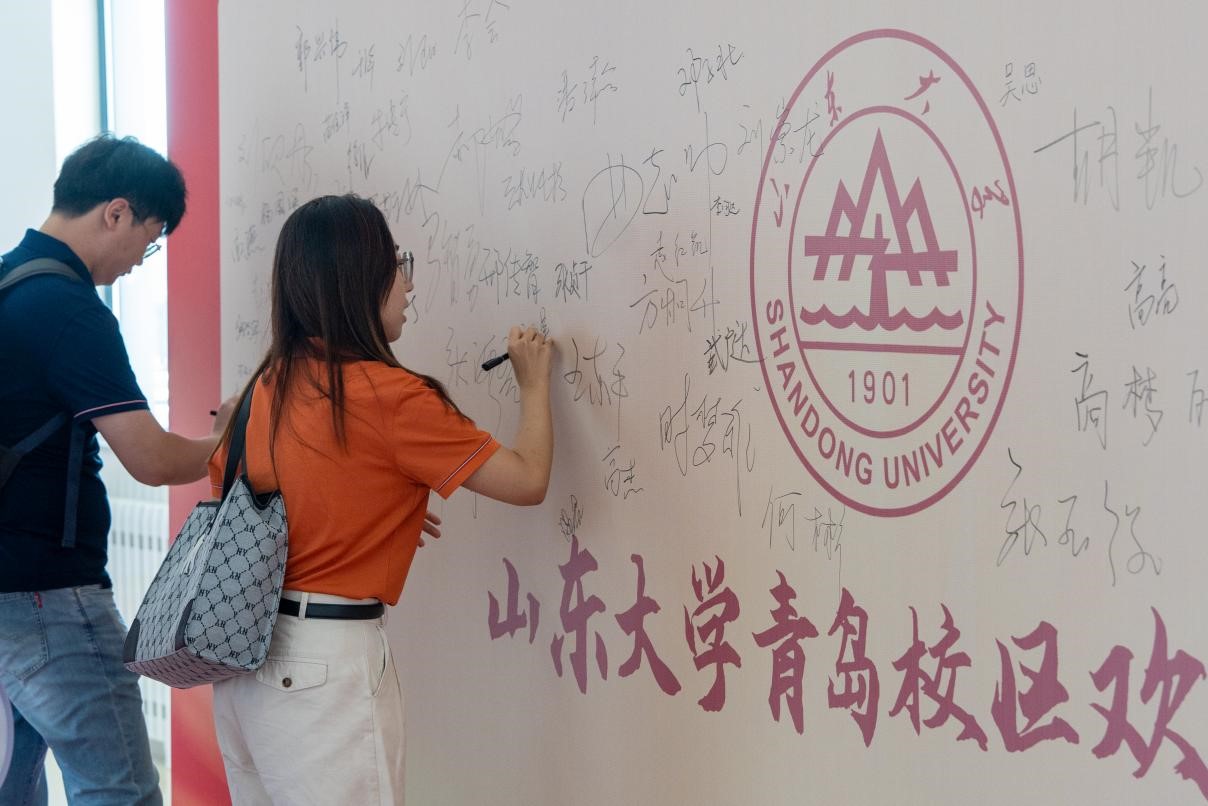 在28日上午的入职典礼上,青岛校区新教工们个个精神饱满、朝气蓬勃地走过华岗苑前红毯,在签名墙上庄严地签下名字。山东大学党委常委、副校长、青岛校区校长曹现强,青岛校区党工委副书记张海波等候在会场门口与大家一一握手、亲切交谈,并送上殷殷嘱托。