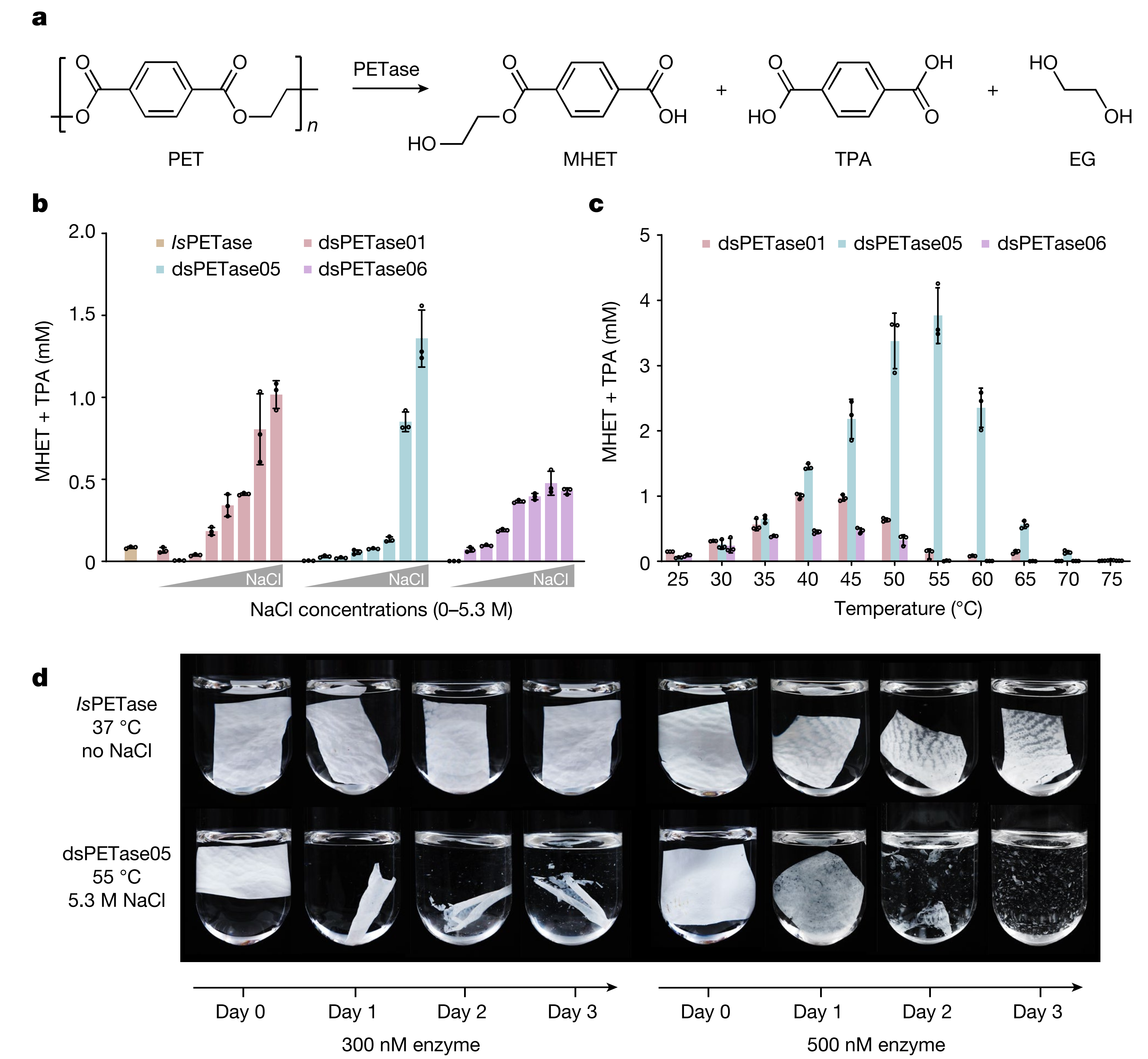 研究团队进一步构建了包含24.58亿非冗余基因序列的蛋白质数据库(GOPC)。针对塑料废弃物对海洋环境造成的日益严峻的白色污染,利用GOPC进行了PET塑料降解酶的定向挖掘,从深海热液喷口及深渊海沟的样品测序数据中筛选出3个嗜盐耐热PET水解酶,其催化活性随NaCl浓度的升高而增加,比陆地微生物中发现的IsPETase活性高12-44倍。活性最高的dsPETase05可在3天内将PET膜大部分降解,降解率达到83%。这是国际上首次从深海中发现的高活性PET水解酶,不仅展示了GOPC在生物勘探领域的应用潜力,也为PET塑料的生物降解与再生这一热点领域提供了全新的工具。
