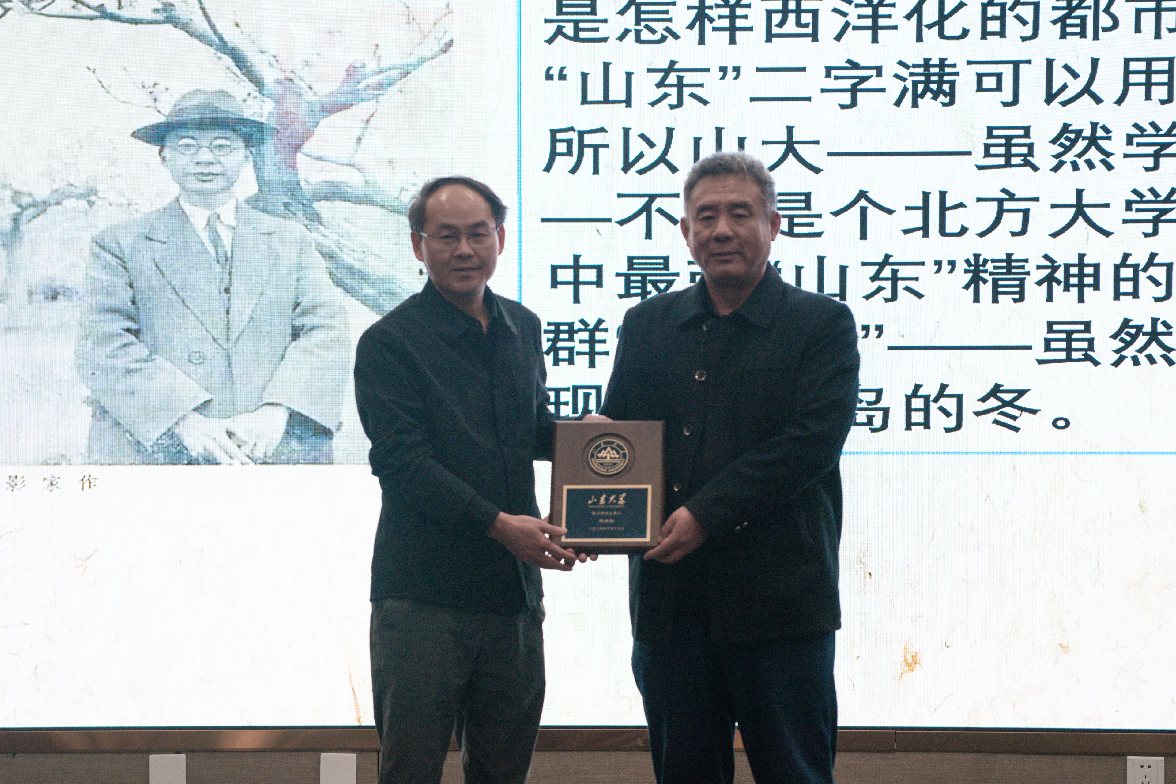 讲座结束后,肖贵田为杨洪勋颁发“鳌山讲坛主讲人”纪念牌。