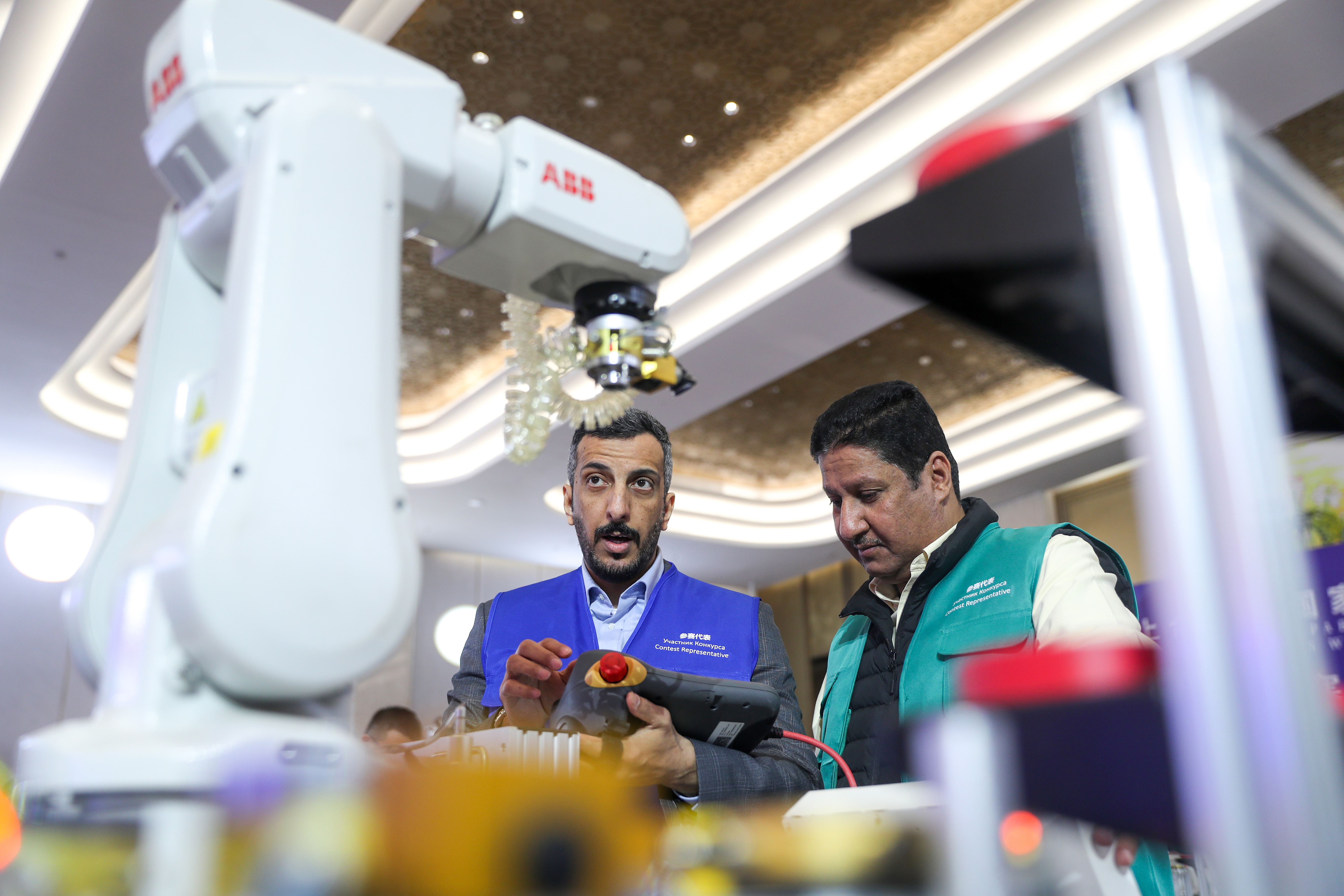 2024年12月18日,第三届上合组织国家职工技能大赛在山东青岛开幕。图为工业机器人操作调整工比赛现场,参赛选手在调试机器人。 中新社记者 张祥毅 摄