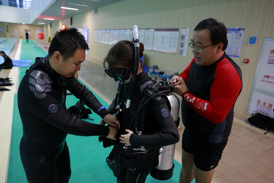 指导学员穿戴潜水装备