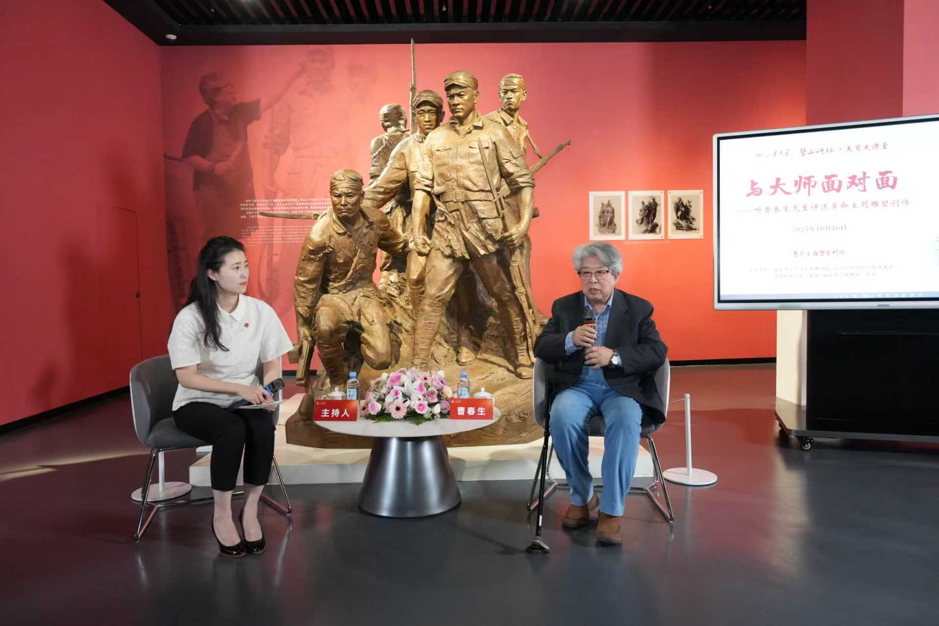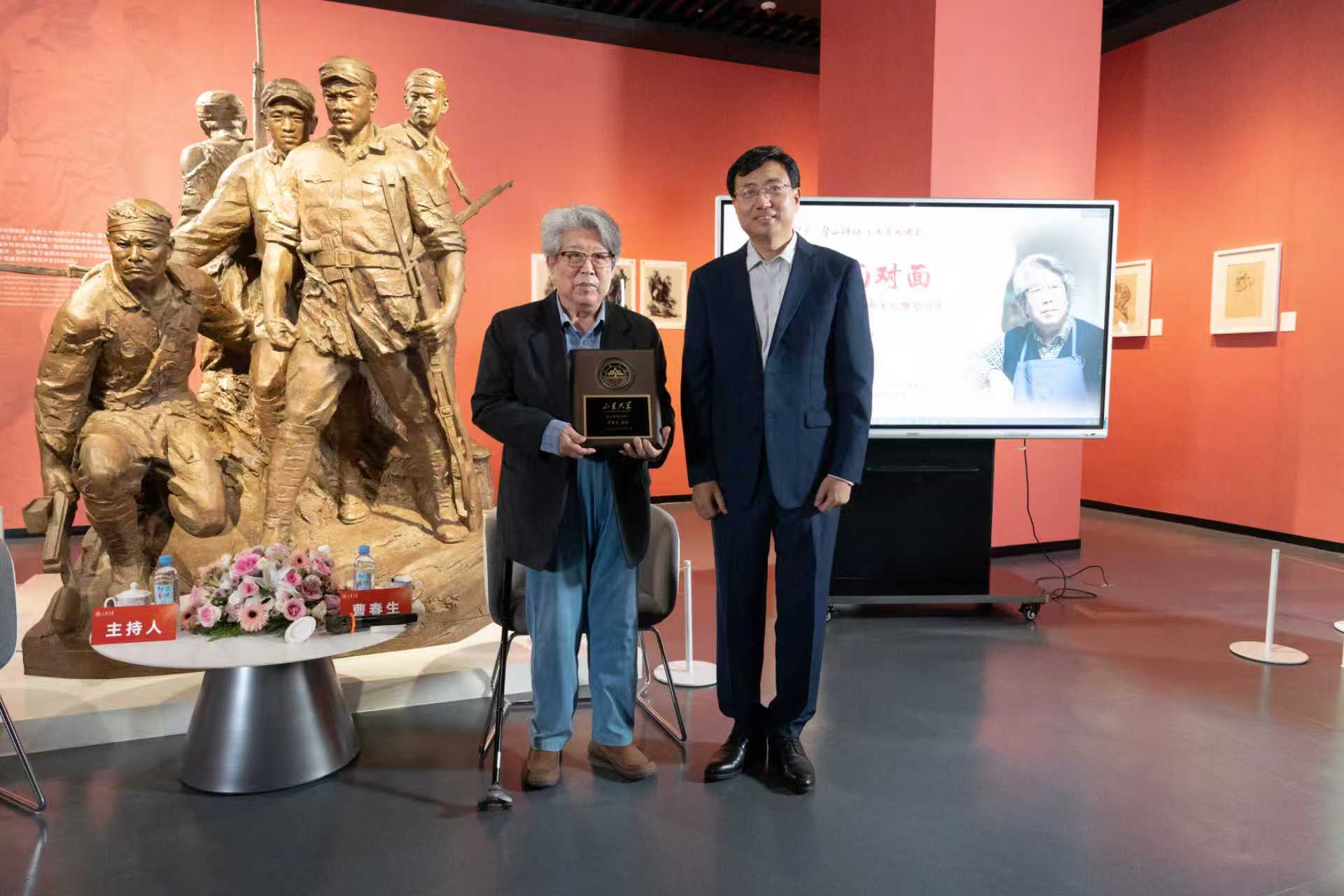 10月16日下午,山东大学兼职讲席教授、中央美术学院教授、著名雕塑艺术家曹春生先生受邀做客“鳌山讲坛”暨“美育大课堂”,以“与大师面对面——听曹春生先生讲述革命主题雕塑创作”为题在艺术馆现场与师生展开深入交流。山东大学校长助理、青岛校区党工委书记邢占军出席活动。