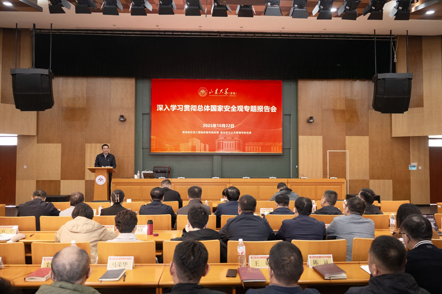 10月22日,深入学习贯彻总体国家安全观专题报告会在青岛校区举行。山东大学副校长、青岛校区校长王美琴出席报告会。青岛校区党工委副书记张海波主持报告会。