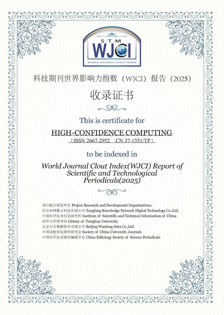《高置信计算(英文)》(High-Confidence Computing,简称HCC,ISSN 2667-2952,CN 37-1551/TP)是目前国际范围内第一本聚焦精准计算、智能计算、可信计算三大范式交叉融合的跨学科英文学术期刊,由山东大学主办,山大科技期刊社与爱思唯尔(Elsevier) 联合出版,山东大学计算机科学与技术学院承办的国际学术期刊,编委团队由来自10余个国家的66位国际一流专家组成,山东大学计算机科学与技术学院院长成秀珍教授、北京航空航天大学副校长吕卫锋教授和美国佐治亚州立大学蔡志鹏教授共同担任期刊主编,入选“中国科技期刊卓越行动计划”高起点新刊项目。