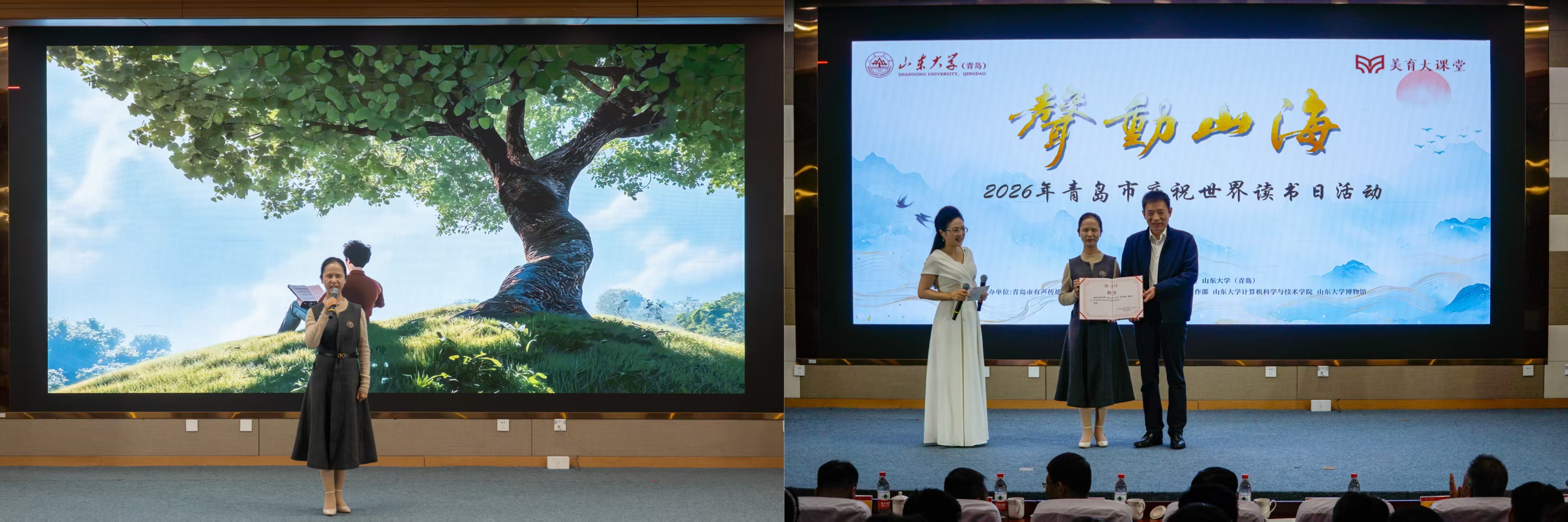 全国首位视障播音硕士、中央人民广播电台主持人董丽娜围绕“以声为光,以书为路”主题,讲述求学路上书籍给予的力量,分享阅读与声音艺术对人生的照亮与滋养。活动现场,董丽娜受聘为山东大学(青岛)美育导师。