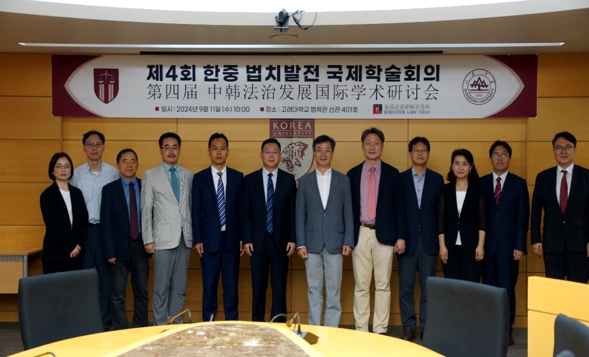 法学院代表团与高丽大学法学院院长李煌、副院长朴钟秀等多位教授进行了座谈交流,就共同建立中韩高端法律人才培训基地、学生互派及联合指导机制、合作举办国际学术论坛等方面进行了富有成效的沟通洽谈,对双方长期友好合作的成果进行了全面深化。高丽大学法学院作为享誉国际的法学学府,以其卓越的法学教育质量和富有影响力的法学研究在法学界享有盛誉。山东大学法学院与高丽大学法学院一直保持着友好合作关系,此前曾签署多个合作协议。