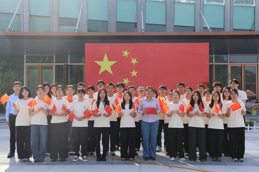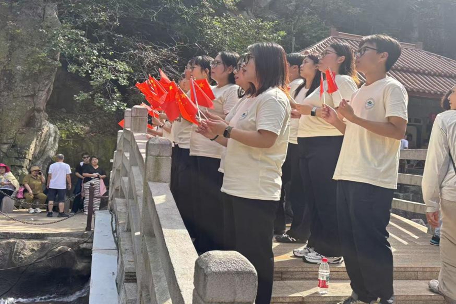 活动伊始,师生队伍在崂山(九水)客服中心前整齐列队,以一曲《我爱你中国》向祖国深情告白,歌声在山谷间回荡,现场气氛热烈而庄严。随后,队伍沿栈道向上行进,在内三水检票广场前共同唱响《如愿》,师生手持国旗,面向青山并肩而立,在山水自然间感受祖国的壮美山河。最后,队伍到达潮音瀑前的石桥上,齐声歌唱《我和我的祖国》,师生以饱满的热情将环保人的责任与情感融入歌声之中。