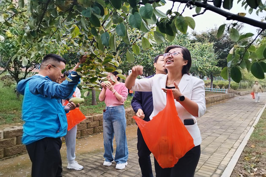 活动现场,木瓜海棠果实盈枝,学生在后勤工作人员指导下分工协作、默契配合,在亲手劳作中体验收获喜悦,共同参与一堂劳育实践课,感悟劳动创造的价值与美好。