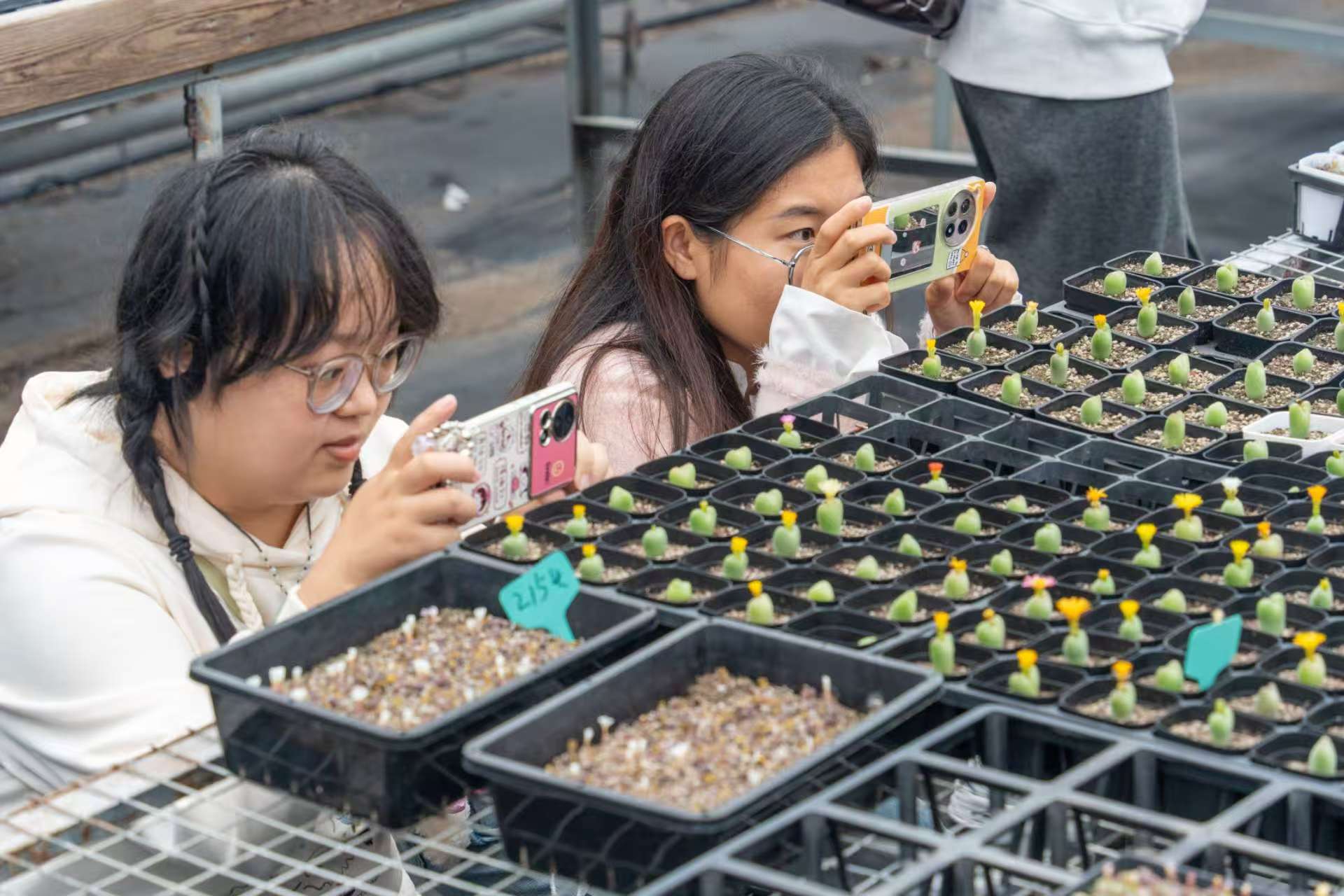 寒露,是秋季的第五个节气,意味着露气寒冷,即将凝结成霜形。在这一季节交替的时刻,多肉植物悄然染上了清霜的淡彩。此次劳动实践以学习多肉植物的生长习性和种植知识为主题,基地负责人曲方阔对多肉植物的种类、特性和养护技巧进行了详细介绍,并分享了景天科和番杏科多肉的特点,讲解了芦荟的清凉解毒作用、生石花的拟态特性以及多肉植物在空气净化与心理舒缓方面的独特功能。同学们在专业人员指导下,学习如何通过形态、色彩和叶序辨识多肉品种,了解多肉养护知识,体验与多肉亲密接触的乐趣。