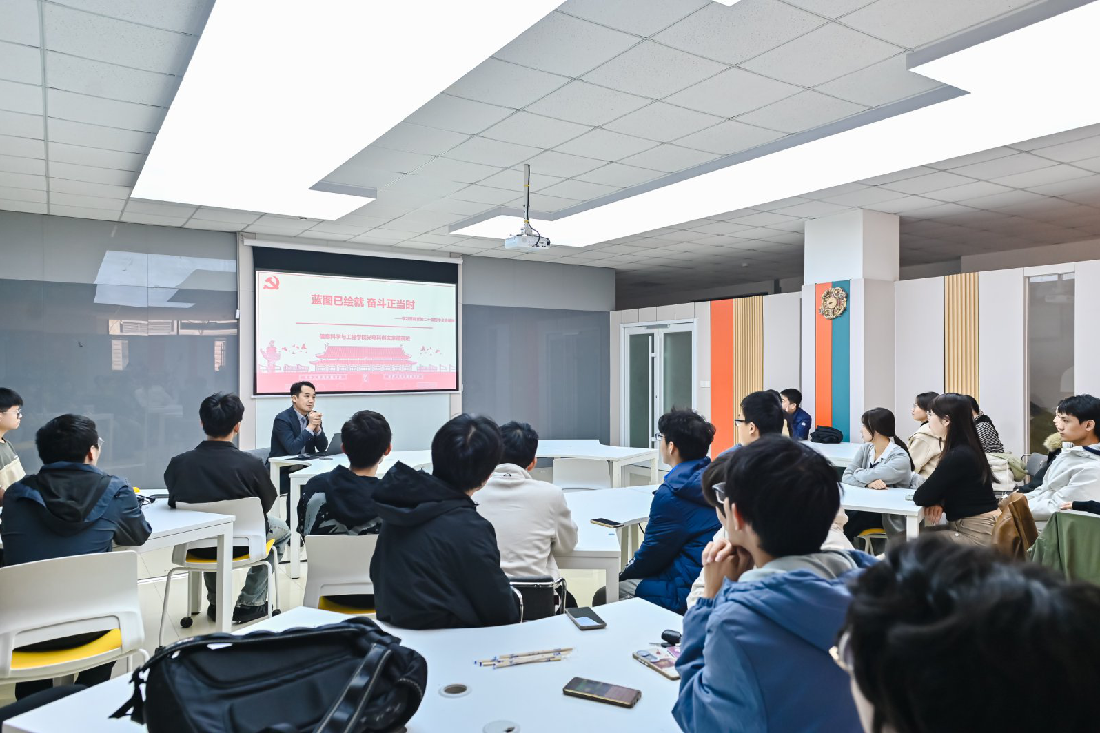 思想引领:让思政课"活"在真实场景中。为深化思政教育创新,推动光电领域人才培养与国家战略紧密结合,刘兆军以“蓝图已绘就,奋斗正当时”为主题,系统解读党的二十届四中全会精神和《中共中央关于制定国民经济和社会发展第十五个五年规划的建议》,引导同学们勇担科技报国使命,将个人发展与国家战略结合起来,既要仰望星空,瞄准科技制高点;更要脚踏实地,在解决“卡脖子”问题中书写青春答卷。他以我国光电技术的发展历程为例,讲述了老一辈光电科研工作者在艰苦条件下,凭借坚定的理想信念和爱国情怀,攻克了一个又一个技术难题,为我国光电事业从跟跑到并跑、领跑做出的巨大贡献。为了让同学们有更直观的感受,他还分享了多个光电科研团队在重大项目中克服困难、坚持创新的真实故事。他鼓励同学们要以这些科研前辈为榜样,将个人的成长与国家的发展紧密结合起来,树立远大的理想和抱负,在实现“十五五”蓝图的新征程中挺膺担当。