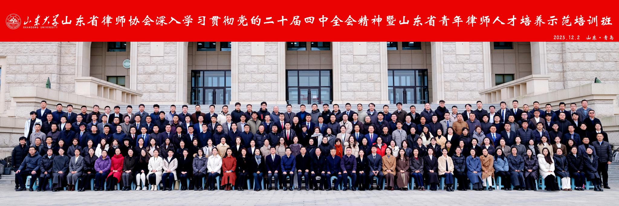 2025年12月2日,山东省律师协会深入学习贯彻党的二十届四中全会精神暨山东省青年律师人才培养示范培训班开班仪式在山东大学青岛校区举行。山东省司法厅律师工作处处长、山东省律师行业党委副书记、省律师协会秘书长刘玉国,山东大学法学院党委书记于向明,山东省律师协会副会长阚吉峰出席开班仪式,仪式由法学院院务委员会常务副主任齐向东主持。