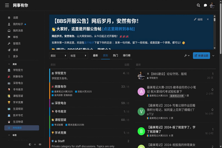 “网事有你”学生论坛以“沉淀校园记忆、凝聚网安力量” 为定位,围绕校园多样化需求构建特色栏目体系,整合了交流分享、成长帮扶与信息传递等多元功能,为全体师生提供了专属的线上互动空间。