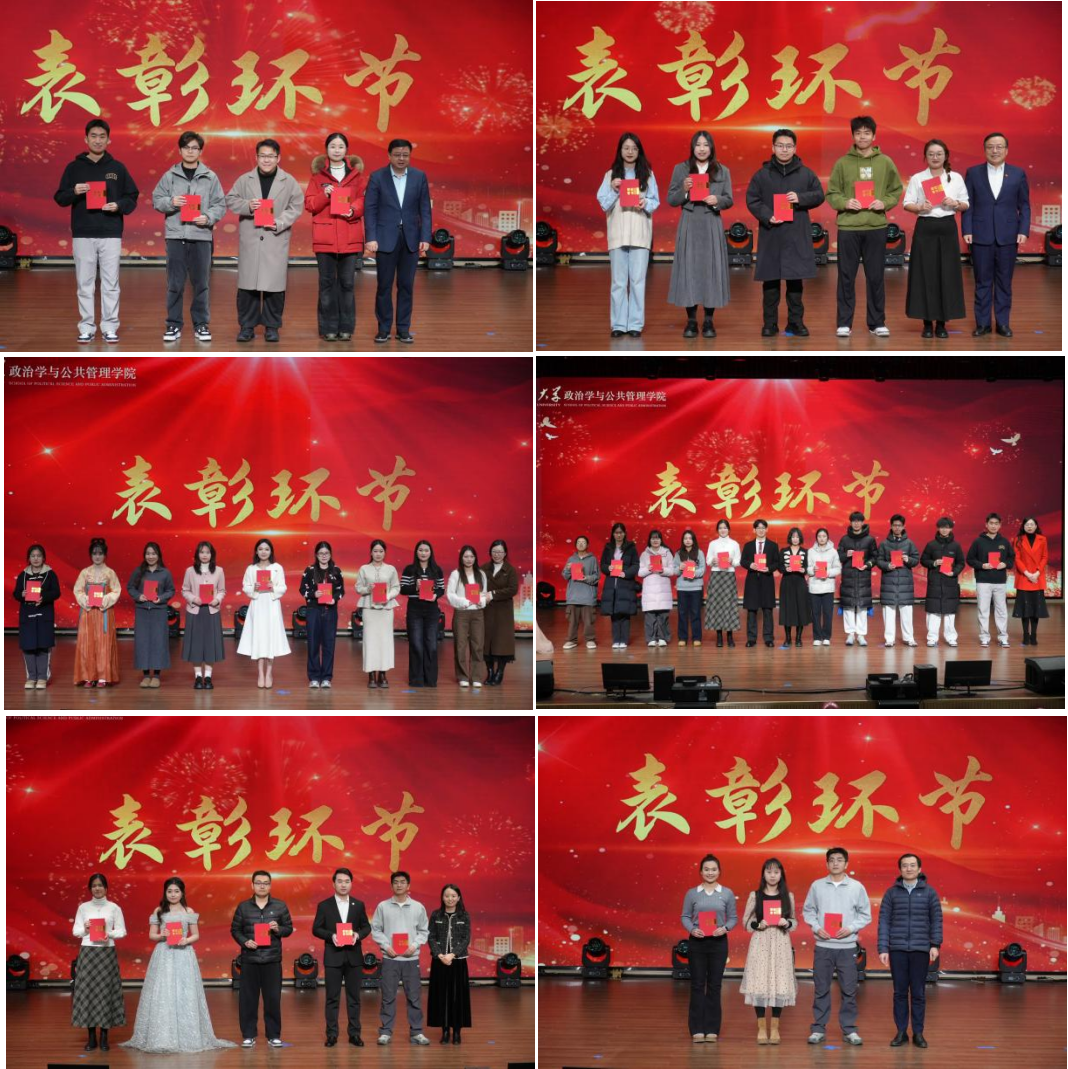 晚会对政管学院2025年度人物进行表彰,学院领导依次为德育引领、学术创新、体育拼搏、美育涵养、劳育实践等领域的代表人物,以及先进班集体代表颁奖,以榜样力量激励全体学子奋勇前行。