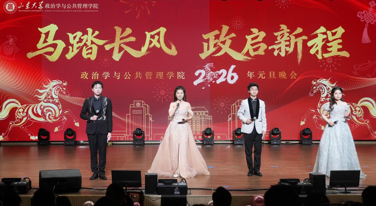 12月21日晚,政治学与公共管理学院举办“马踏长风 政启新程”2026年元旦晚会。政管学院院长马奔,学院党委书记李海燕,学院党委副书记马桂兰,学院党委副书记石莹,学院副院长赵婷,学院副院长孙宗锋,以及学院教师代表、本硕博学生300余人参加活动。