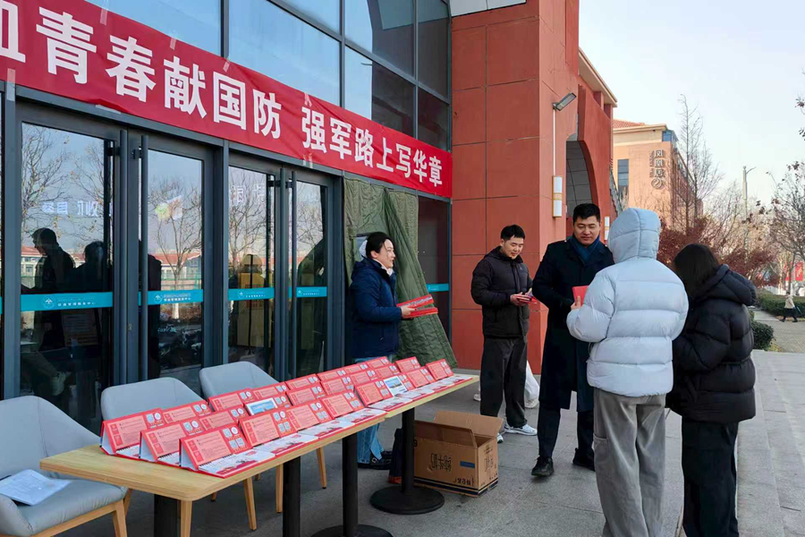 1月13日,在校区学生工作部和即墨区人民武装部指导下,大学生国防教育协会在曦园餐厅门口开展了征兵宣传活动,为寒冬的校园增添了一抹火热的“迷彩绿”。