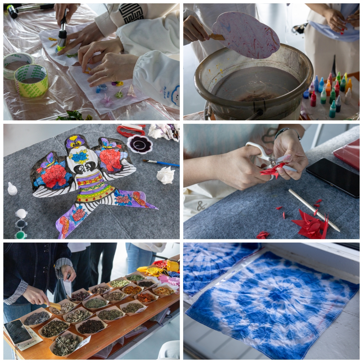 活动选取纸鸢绘春、蓝染成韵、草木留影、漆彩流光、红裁纸韵、香囊蕴意六项传统非遗技艺,打造沉浸式体验。纸鸢绘春环节,师生以笔为媒,在风筝上描绘春日图景,寄托美好期许;草木留影环节,通过植物拓印定格自然生机;蓝染成韵与漆彩流光,展现了传统染色与漆艺的雅致灵动;红裁纸韵,以剪纸技艺让红纸焕发新生;香囊蕴意,则结合了艾草、薰衣草等香料与布艺,兼具芳香疗愈与文化传承价值。参与者在慢工细作中静心减压,感受传统技艺与心灵疗愈的双重魅力。