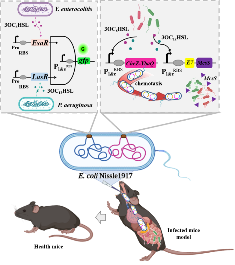人类与野生动物、牲畜和病原体之间的接触在全球范围内不断增加,导致由两种及以上病原体共同感染而引发的疾病概率大大增加,迫切需要用于预防合并感染的新方法。以大肠杆菌Nissle 1917(EcN)为代表的工程益生菌,正成为靶向治疗传染病的下一代活体生物药物。本研究基于AND逻辑门原理,在益生菌大肠杆菌Nissle 1917(EcN)中构建了双信号响应系统,使其在铜绿假单胞菌、小肠结肠炎耶尔森菌两种病原菌共存时,在体外实现定向趋化与高效杀菌。进一步通过小鼠双重肠道感染模型验证该工程益生菌EcN对两种病原体具有显著防治效果。