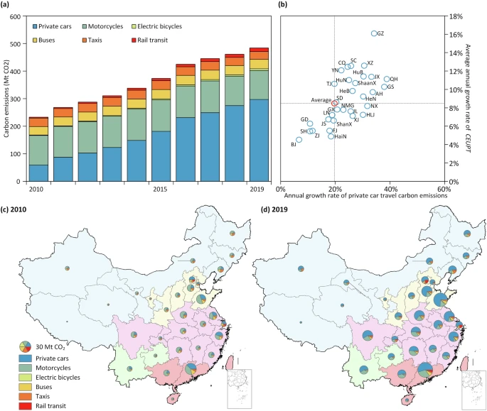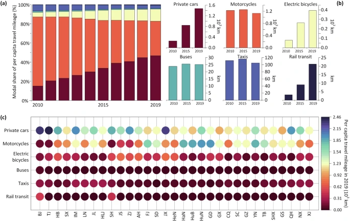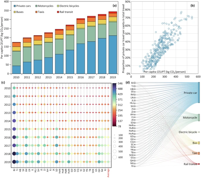 由于机动车保有量的迅猛增长,交通运输部门目前已占全球能源消耗的21%和碳排放的近四分之一。然而,不同气候带省域城市客运交通碳排放(CEUPT)的水平及其受气候条件影响的机制仍不明确。本文构建了一个“自下而上”的碳排放核算模型,量化了中国31个省份的CEUPT,并进一步揭示了气候与社会经济条件共同影响CEUPT的作用机制。结果表明,2019年中国城市客运交通碳排放总量为483.7百万吨CO₂,碳排放强度为0.108 kgCO₂/km。其中,私家车和摩托车是碳排放的主要来源,分别贡献了295.8百万吨(61.2%)和105.66百万吨(21.9%)的碳排放。气候条件决定了居民初始的出行方式选择,而社会经济条件则使人们能够实现出行偏好,从而共同导致了CEUPT在时空上的差异。这些研究发现可为不同气候区的政府部门在制定城市客运节能政策时提供参考,促使其更加充分地考虑气候与社会经济因素,从而制定更具针对性的碳排放控制策略。