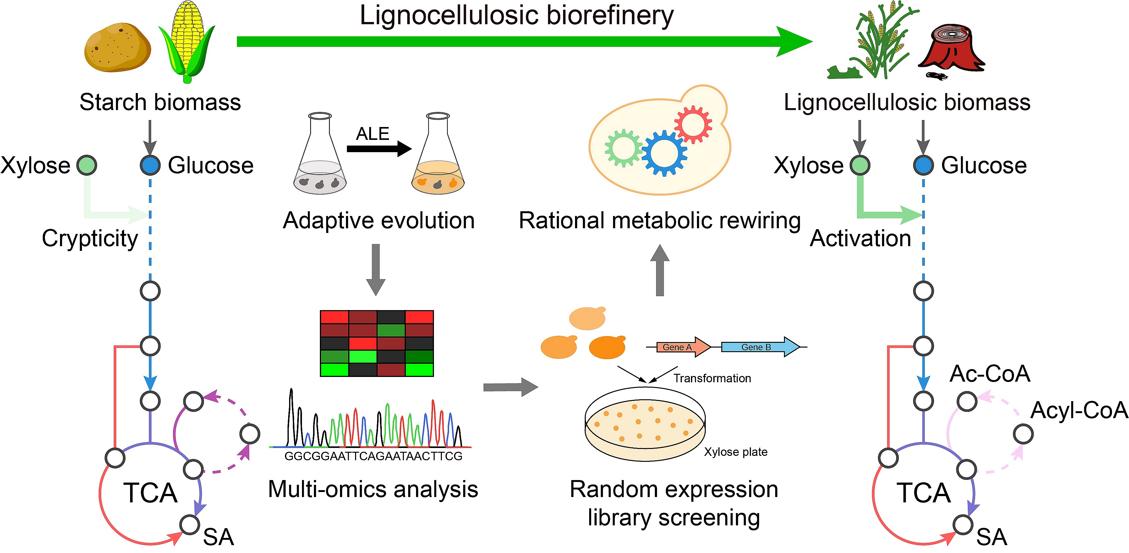丁二酸是合成生物可降解塑料(如PBS)、食品添加剂和药品的关键平台化合物,市场需求巨大。祁庆生团队在前期研究中改造非常规酵母—解脂耶氏酵母,构建了一系列利用葡萄糖高产丁二酸的酵母工程菌株(Nature Communications, 2023)。然而,当以木质纤维素水解液(富含木糖)为碳源时,发现该工程菌株无法高效利用木糖。根源在于其还原丁二酸合成途径与木糖分解代谢途径在关键碳通量和氧化还原分配上存在竞争冲突,导致木糖利用率低下、丁二酸合成受阻。