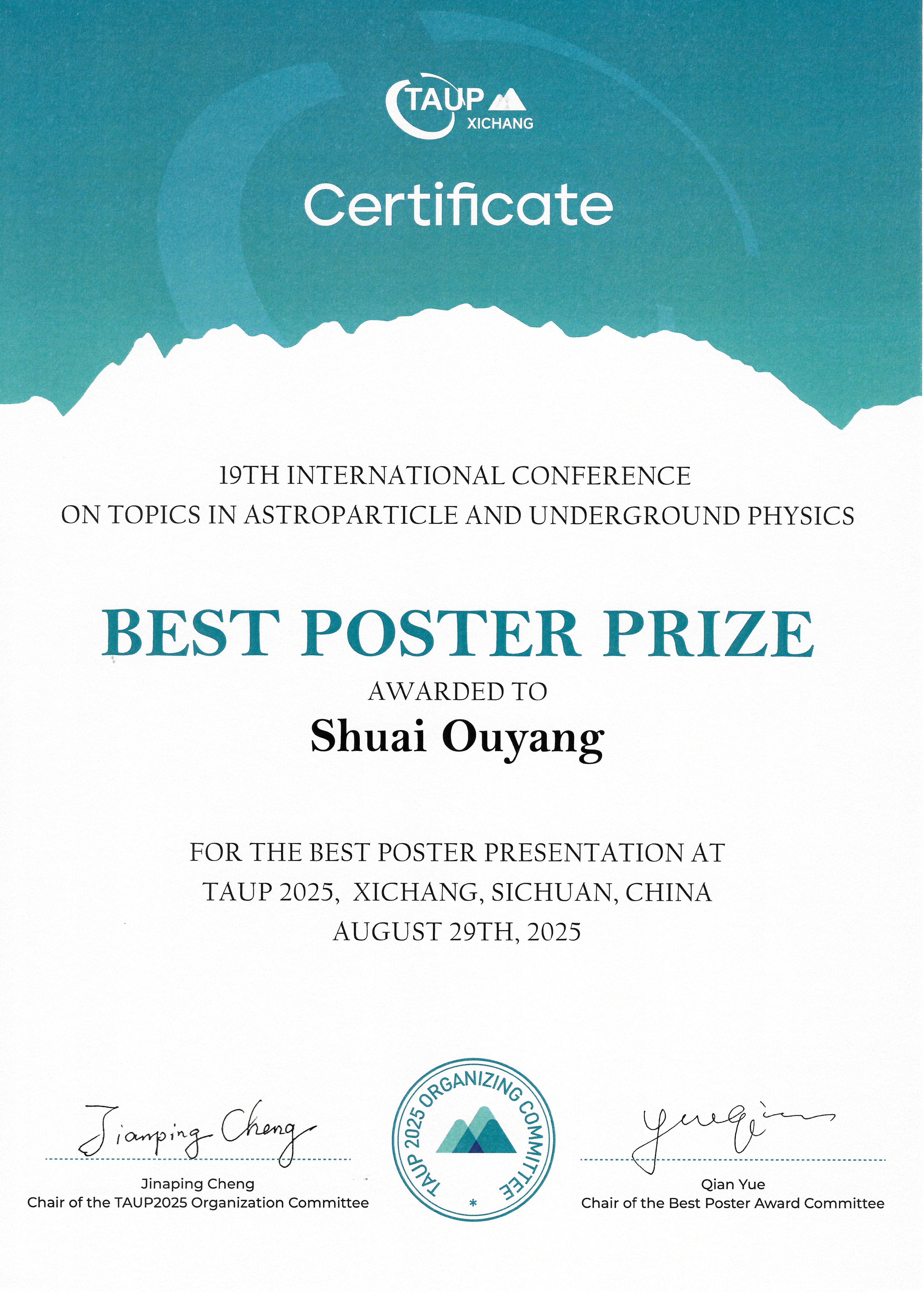 TAUP会议每两年举办一次,本届会议于2025年8月24至30日在中国四川西昌召开,组委会包括清华大学、北京师范大学、中国科学技术大学、中科院理论物理所、亚太理论物理国际中心和雅砻江水电发展有限公司,会议受到国家自然科学基金委员会、中国物理学会、中国物理学会高能物理分会和IUPAP(国际理论和应用物理学联合会)的资助。今年的TAUP会议汇聚了来自全球的学者与青年研究人员共约600人,围绕中微子物理、暗物质探测、宇宙线物理及相关地下实验等领域进行深入交流。欧阳帅的研究成果在大会上受到同行的积极关注,展现了我校研究生在国际学术交流中的良好风貌。