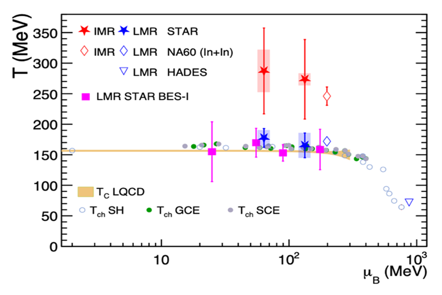 研究团队基于RHIC能量扫描二期计划中采集的54.4GeV和27GeV金核-金核碰撞数据,测量了热辐射产生以及ρ介子衰变产生的正负电子对的不变质量,实现了QGP不同演化阶段温度的直接测量。实验结果显示,QGP早期的温度可达太阳核心温度的22万倍(约3.3万亿度),并随着费米尺度的时间演化逐渐降温。有趣的是,不同能量下测量到的后期温度都相近,并与发生相变的预期温度一致。这些测量与发现为核物质相变研究提供了重要的实验依据。