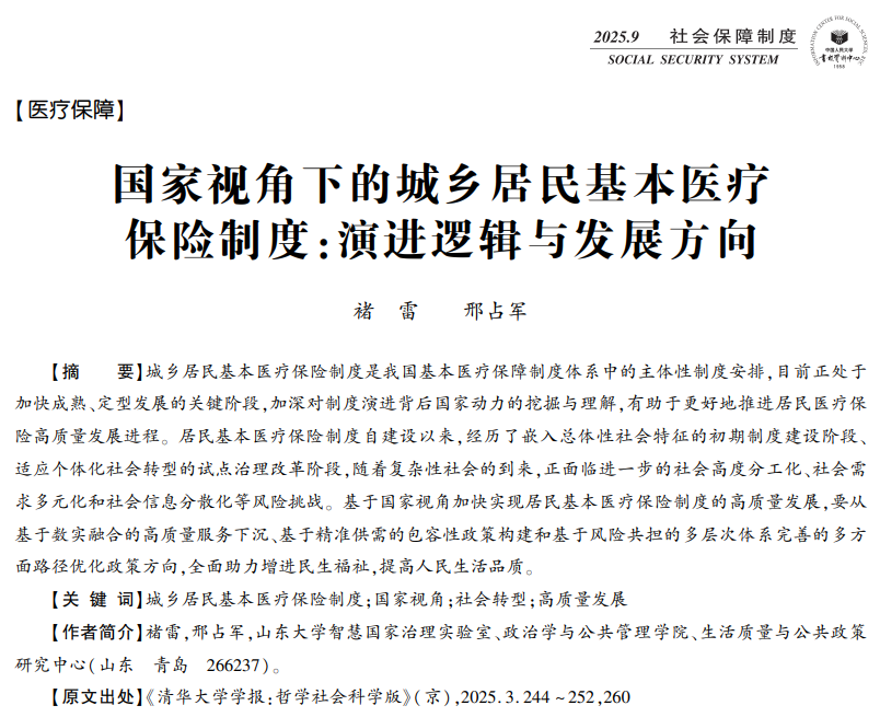 近日,山东大学政治学与公共管理学院褚雷助理研究员与邢占军教授合作发表在《清华大学学报(哲学社会科学版)》2025年第3期的论文《国家视角下的城乡居民基本医疗保险制度:演进逻辑与发展方向》被中国人民大学书报资料中心复印报刊资料《社会保障制度》2025年第9期全文转载。