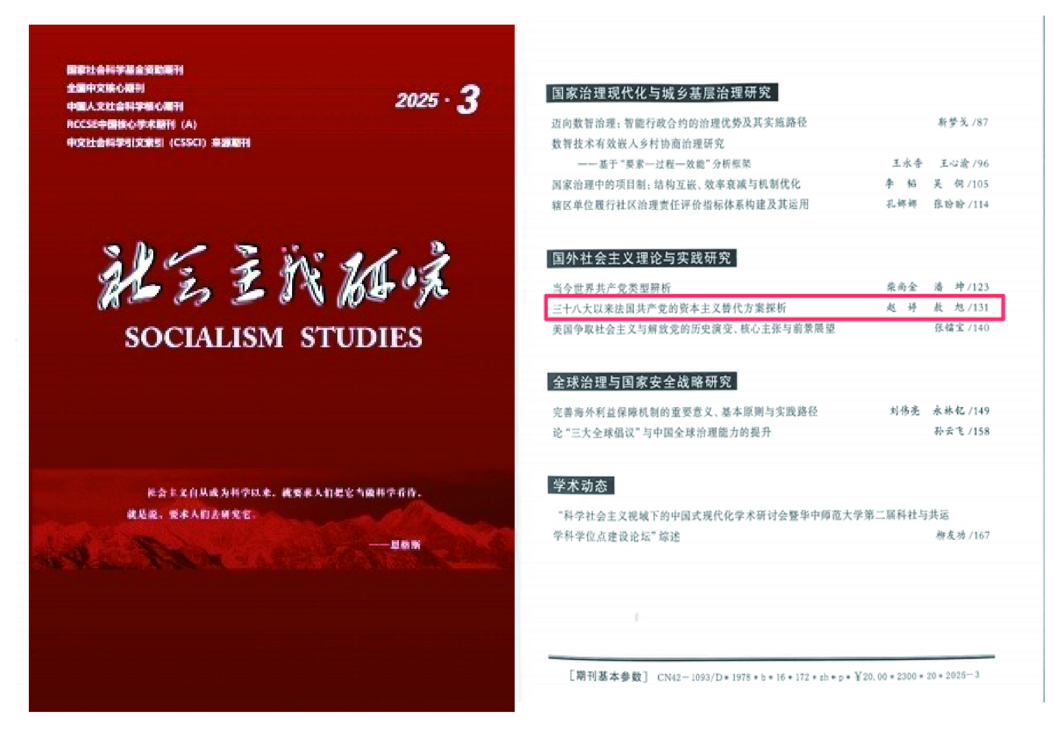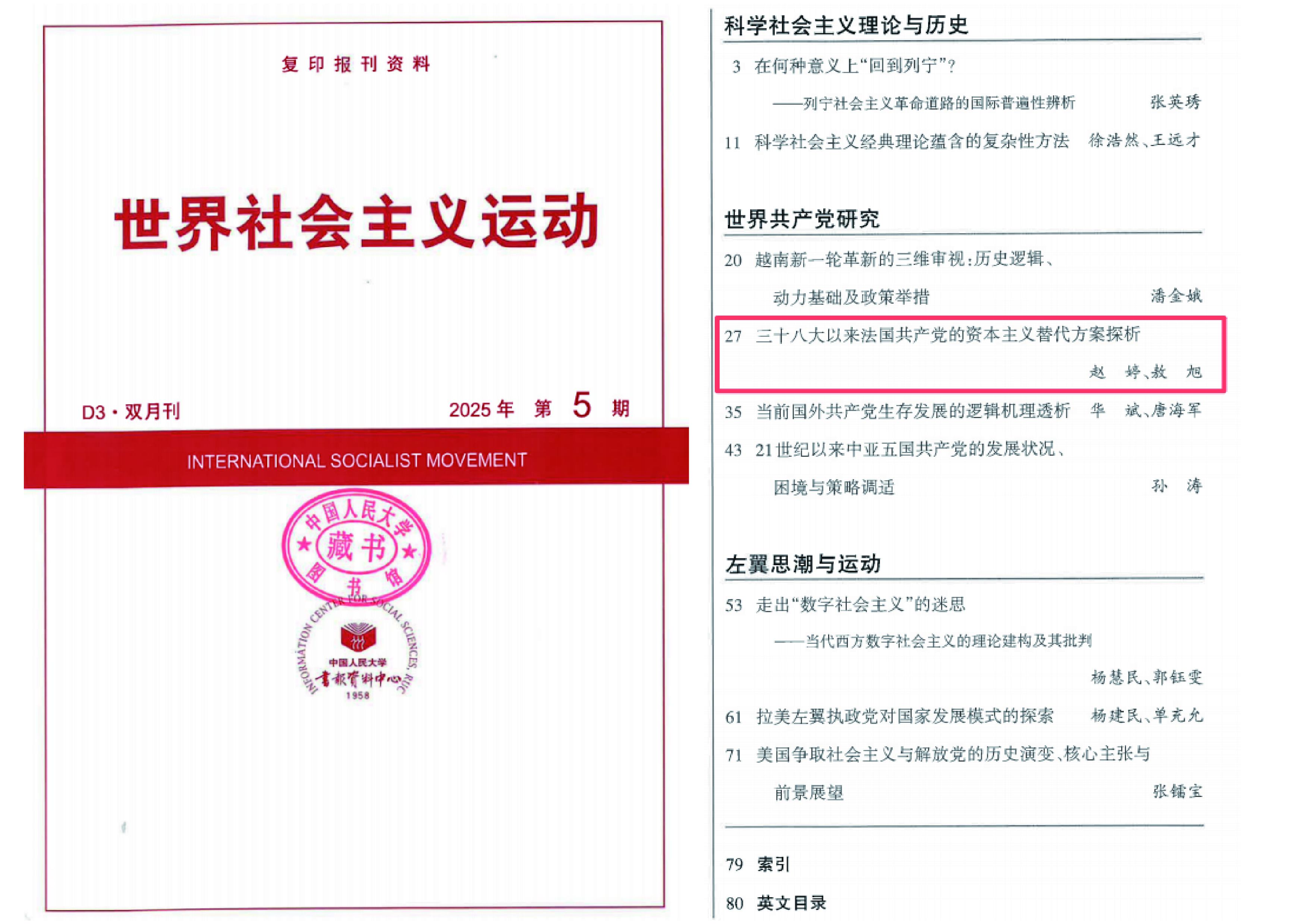 近日,山东大学政治学与公共管理学院赵婷教授与中国人民大学国际关系学院博士研究生敖旭(山东大学政管学院2023届中共党史专业硕士毕业生)合作发表在《社会主义研究》2025年第3期的论文《三十八大以来法国共产党的资本主义替代方案探析》被中国人民大学书报资料中心复印报刊资料《世界社会主义运动》2025年第5期全文转载。