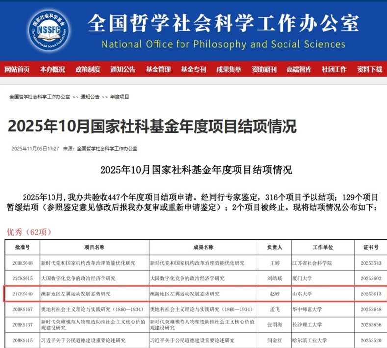 2025年10月,由山东大学政治学与公共管理学院、当代社会主义研究所赵婷教授主持的国家社会科学基金青年项目《澳新地区左翼运动发展态势研究》在国家社科基金结项鉴定中获评“优秀”。这一成果不仅丰富了当前学术界有关澳新地区左翼运动的系统研究,也为世界社会主义运动研究提供了区域国别视角的创新探索,彰显了研究团队扎实的学术功底与前沿的问题意识。