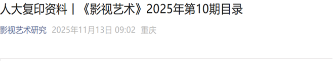 近日,人文艺术研究院特聘教授周安华发表于《电影艺术》的论文《视听新媒体场域与电影文体的革命性重建》被中国人民大学复印报刊资料《影视艺术》2025年第5期全文转载;发表于《长江学术》的论文《再论“电影语言现代化”问题》被同刊2025年第10期全文转载。
