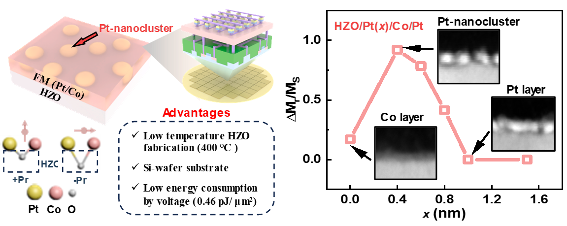 目前,传统电流驱动式自旋器件普遍面临高能耗问题,而电压驱动磁电器件虽具备超低写入能耗优势,却在CMOS工艺兼容性方面面临衬底材料与加工温度等挑战。围绕这一问题,课题组与中国科学院微电子研究所等单位联合开发出一种基于“铪基铁电-Pt/Co纳米团簇”结构的新型磁电器件。该器件通过Pt纳米团簇对Co-O键合行为及铪基铁电层中氧迁移过程的精细调控,实现了低能耗的电压驱动磁反转。该成果为构建CMOS兼容的低功耗磁电逻辑与存储集成技术提供了重要支撑。中科院微电子所博士生龚帅宇、博士后李彦如与山东大学信息科学与工程学院2023级硕博连读生李晓鹏为共同第一作者,武继璇研究员与中科院微电子所杨美音副研究员、罗军研究员为共同通讯作者。