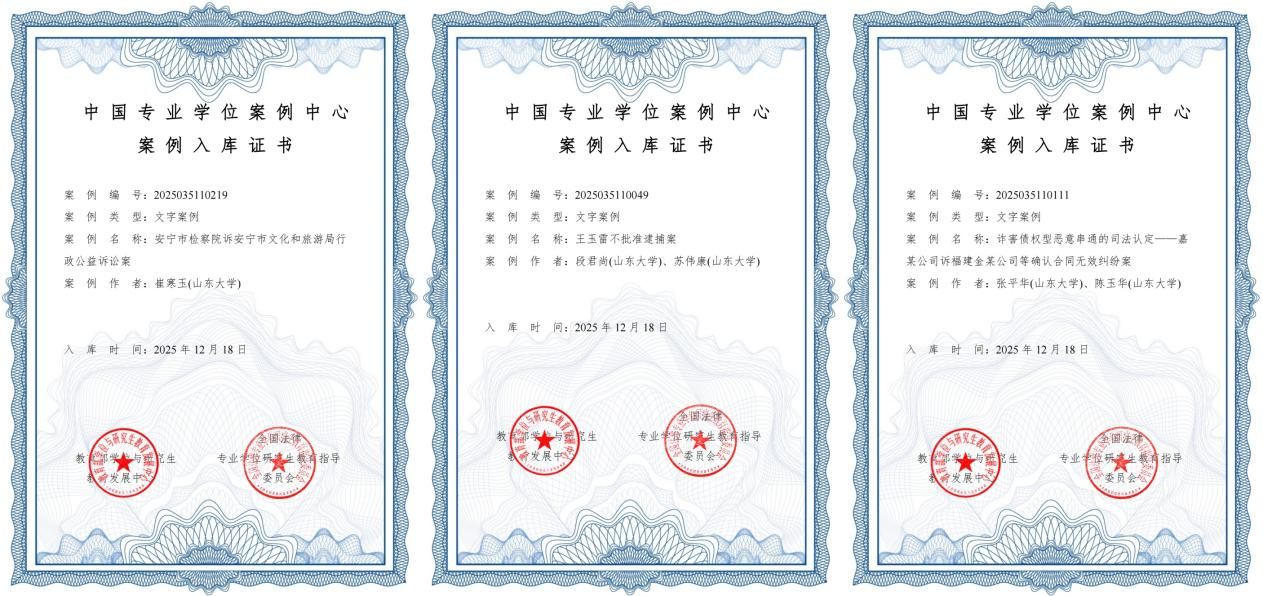 12月18日,由法学院崔寒玉、段君尚、张平华教师分别作为第一案例作者的3项文字案例被中国专业学位案例中心收录。