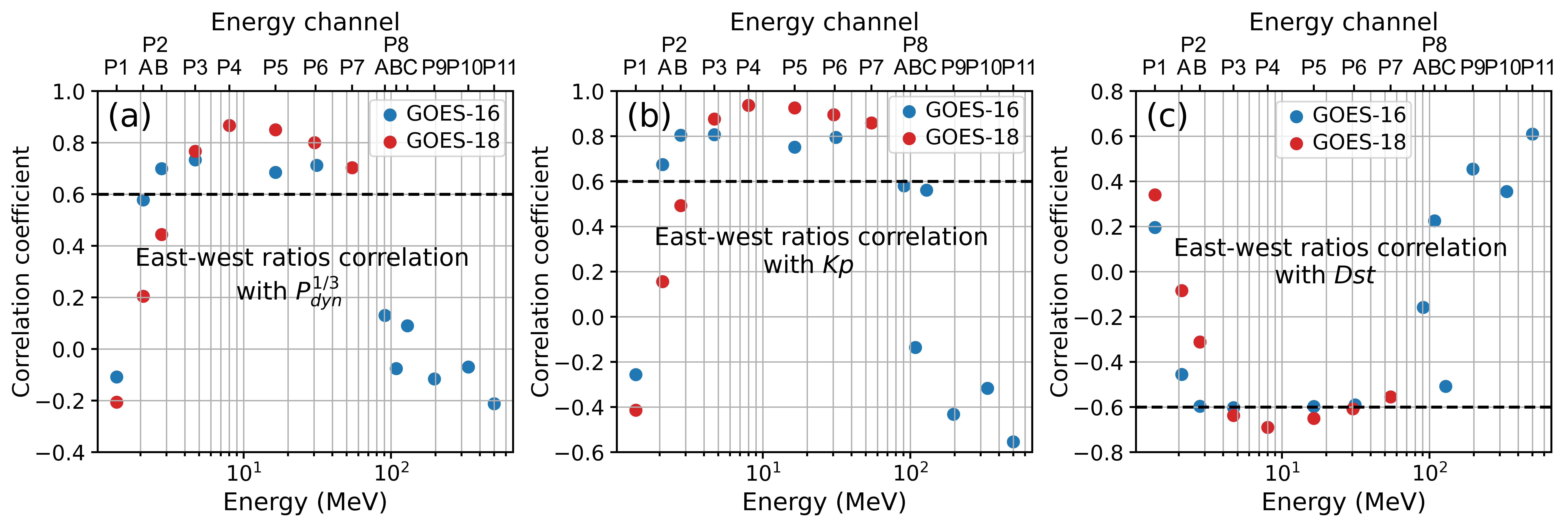 图2:地球同步轨道上的高能质子东西通量比与太阳风动压的三分之一次方、Kp指数和Dst指数相关系数(作为能量的函数)