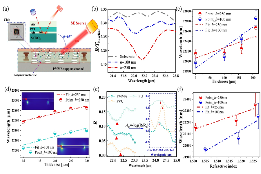 团队提出一种基于 SPhPs的超薄 SrTiO3/Ge 混合超表面,突破典型FIR器件对厚度的依赖性瓶颈问题。全波数值模拟表明,以 SrTiO3作为 SPhPs 传输介质、以高折射率 Ge 作为极化近场扰动元原子,可在超薄几何下实现强共振与高效耦合。研究揭示了高频与低频 Reststrahlen 带内局域LSPhPs共振行为差异的物理起源。此外,采用光谱椭圆仪测量了 2-30 μm波段吸收光谱与椭偏参数,成功捕捉到~22 μm 处的强共振,从而为机理解释提供了额外证据。与传统声子‑极化激元平台相比,该超表面呈现角度无关的共振特性,并实现了较高品质因数(Q≈100)。基于上述特性,开展了聚合物检测的概念验证,证明了远红外模式可实现高效的厚度传感与材料识别。本工作展示了在长波共振与超薄器件之间实现协同的设计路径,为超薄FIR超表面器件的开发提供了新的思路。