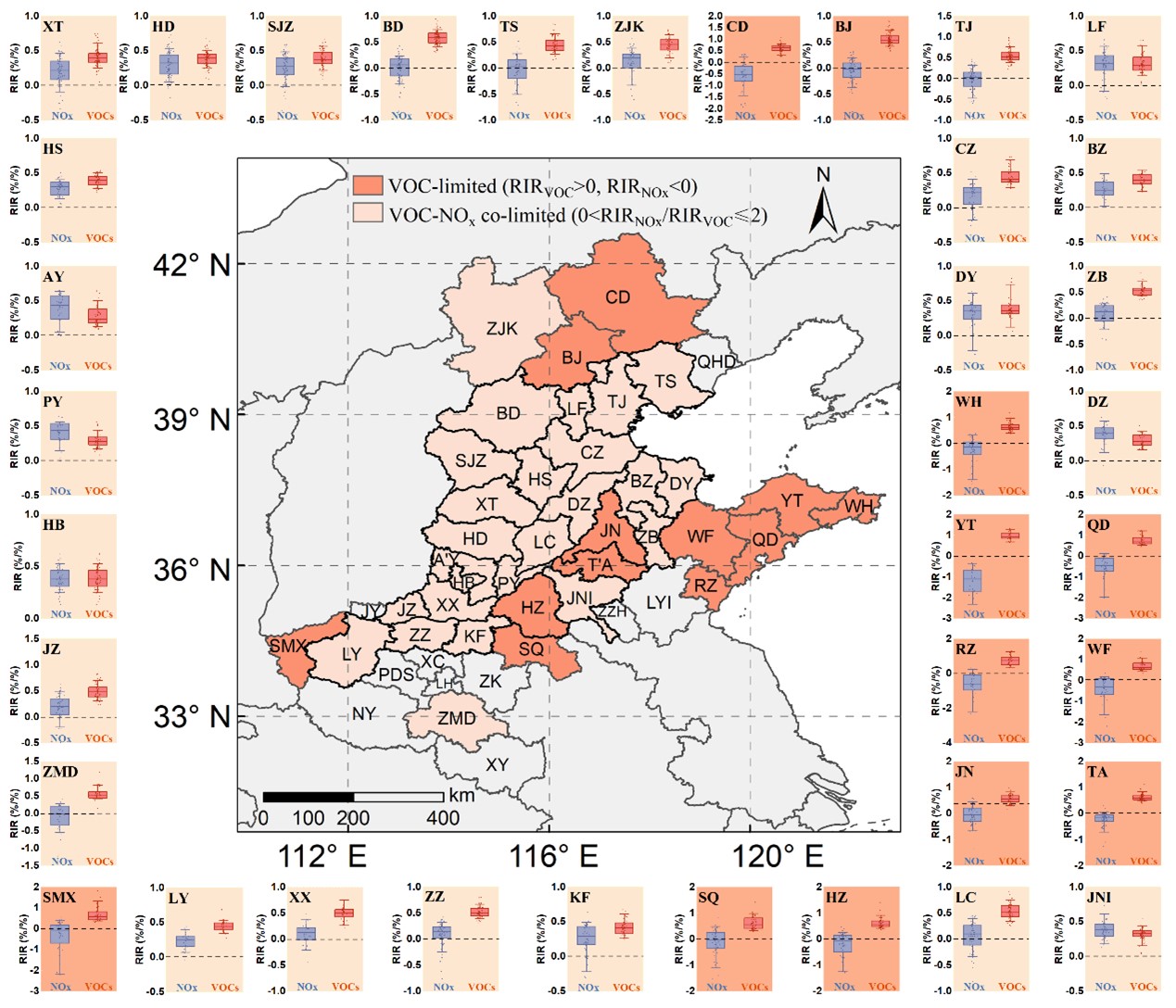 图一2021年6-8月华北平原37个城市臭氧生成机制空间分布。地图周边展示了各城市臭氧前体物的相对增量反应活性(RIR)。地图中城市的颜色及其周围箱式图的底色分别表示VOC限制(深橙色)和VOC–NOx共同限制(浅橙色)两种臭氧生成机制。