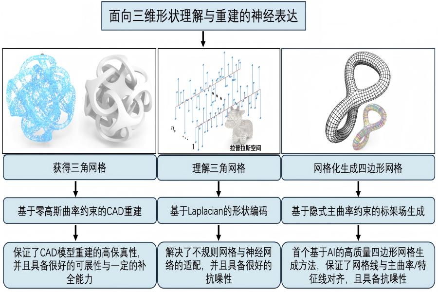 论文聚焦“几何AI + CAX”,面向“获得--理解--网格化”全链条提出系统方法,在CAD曲面重建、网格理解与高质量四边形网格生成等方向形成系列成果,为智能制造和制造业数字化转型提供了关键技术支撑。在CAD模型重建方面,利用CAD模型表面分片光滑的特点,解决了已有技术难以重建高质量的复杂CAD模型的痛点,大幅提升了重建过程的鲁棒性与输出质量。在网格理解与分析方向,提出Laplacian2Mesh突破了传统神经网络处理不规则三角网格的瓶颈,显著提升了神经网络处理三角网格形状的准确性与鲁棒性,该成果入选ESI高被引论文。在网格生成方面,提出了基于深度学习的四边形网格生成技术,该方法开创了无监督优化生成四边形网格的先河,有效克服了传统方法难以兼顾多尺度几何特征的难题,显著提升了网格质量。