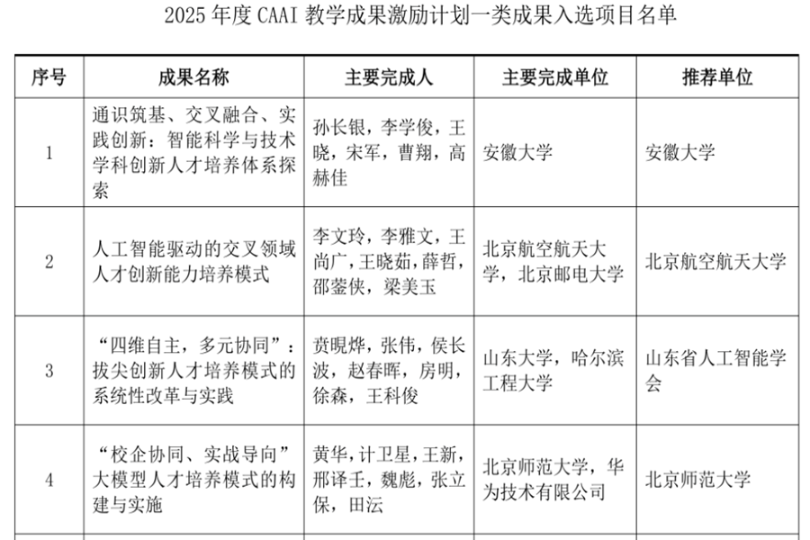 中国人工智能学会(CAAI)设立CAAI教学成果激励计划,旨在激励在中国人工智能领域从事教育教学、教学管理或教育研究,并取得突出成绩、做出突出贡献的教学工作者或是教育管理者,贯彻落实创新驱动发展战略,服务科技强国建设,提高人才培养质量,促进科技人才梯队建设,推动人工智能领域的技术进步与创新。2025年中国人工智能学会持续推进激励计划的推荐及评选工作,经过形式审查、三轮评审和公示,本年度共有17个成果入选CAAI教学成果激励计划。其中9项成果入选CAAI教学成果激励计划一类成果,8项成果入选CAAI教学成果激励计划二类成果。