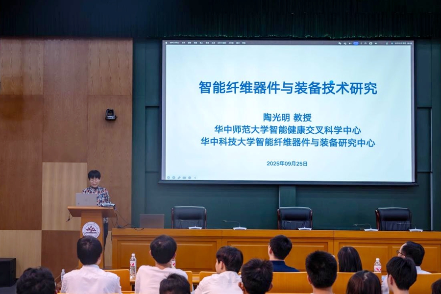 陶光明带来题为“智能纤维器件与装备技术研究”的前沿报告。结合团队前期的科研成果,系统展示了智能健康交叉科学领域的最新突破。他介绍了通过纤维内纳米颗粒与纤维间微米结构的协同设计,实现宽光谱光热的精准调控,以及该技术在汽车内部、人体皮肤表面降温场景中的实践效果。此外,陶光明表示无感化技术的研发思路——从提升电子织物交互精度,到构建“传感-传输-处理”一体化的生命体征监测体系,让长期、实时的健康数据采集成为可能。他勉励青年学子:“光学技术的应用远不止于成像与通信,将光学功能融入纤维,让健康监测可穿戴、装备更智能,这是光学人的新赛道。希望大家能怀揣着对科学的热爱与对未知的好奇,勇于探索,敢于创新。”