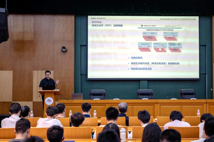 张华年则围绕“基于特殊波段激光的无荧光剂PDT技术及应用”展开报告。他回顾了光动力疗法(PDT)半个世纪以来的发展历程,指出传统光敏剂“浓度窗口窄、毒理风险高”一直是限制PDT大规模临床推广的核心瓶颈。目前,全球首套无荧光剂PDT医疗设备已完成多中心临床试验,正式进入注册阶段,有望为皮肤科、运动康复科及风湿免疫科提供更安全、可重复的微创治疗新选择。报告现场,张华年还分享了从实验室样机到产业化落地“十年磨一剑”的创业经历,勉励学弟学妹“把论文写在祖国大地上”。