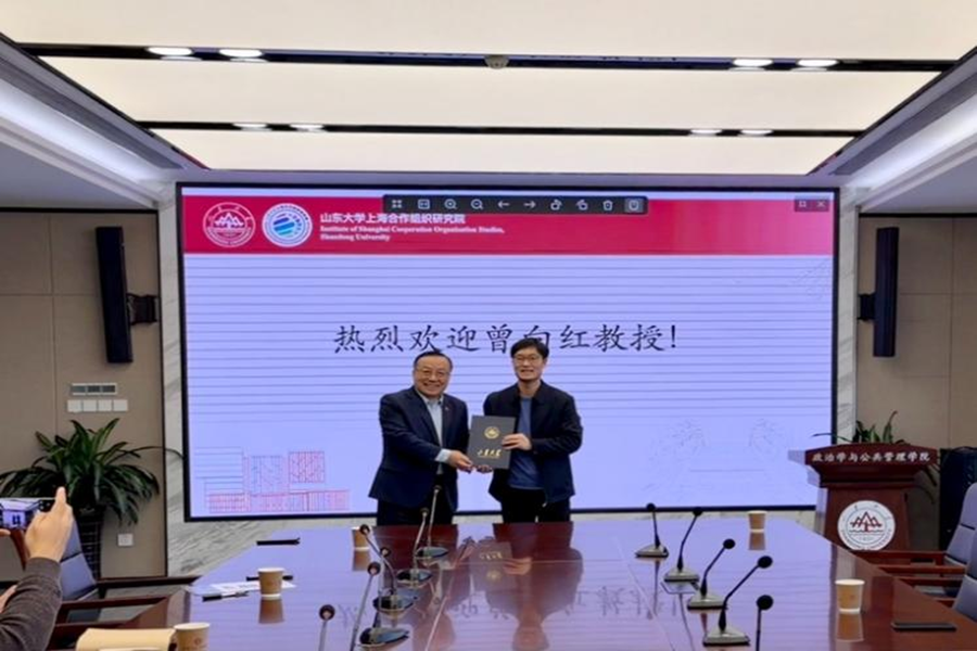 政管学院党委书记李海燕为曾向红教授颁发山东大学上海合作组织研究院高级研究员聘书。