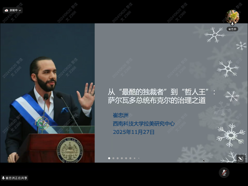 11月27日,由山东大学政治学与公共管理学院、山东大学亚太研究所主办,亚太研究所拉美研究中心承办的“社科与人文”系列讲座第三十八讲在线上成功举办,讲座题目为“从‘最酷的独裁者’到‘哲人王’:萨尔瓦多总统布克尔的治理之道”。本次讲座由西南科技大学拉美研究中心副教授崔忠洲主讲,亚太所拉美研究中心主任李振主持,亚太所大国关系与地区安全研究中心副主任季丽新、亚太所拉美研究中心助理研究员史话担任与谈人。