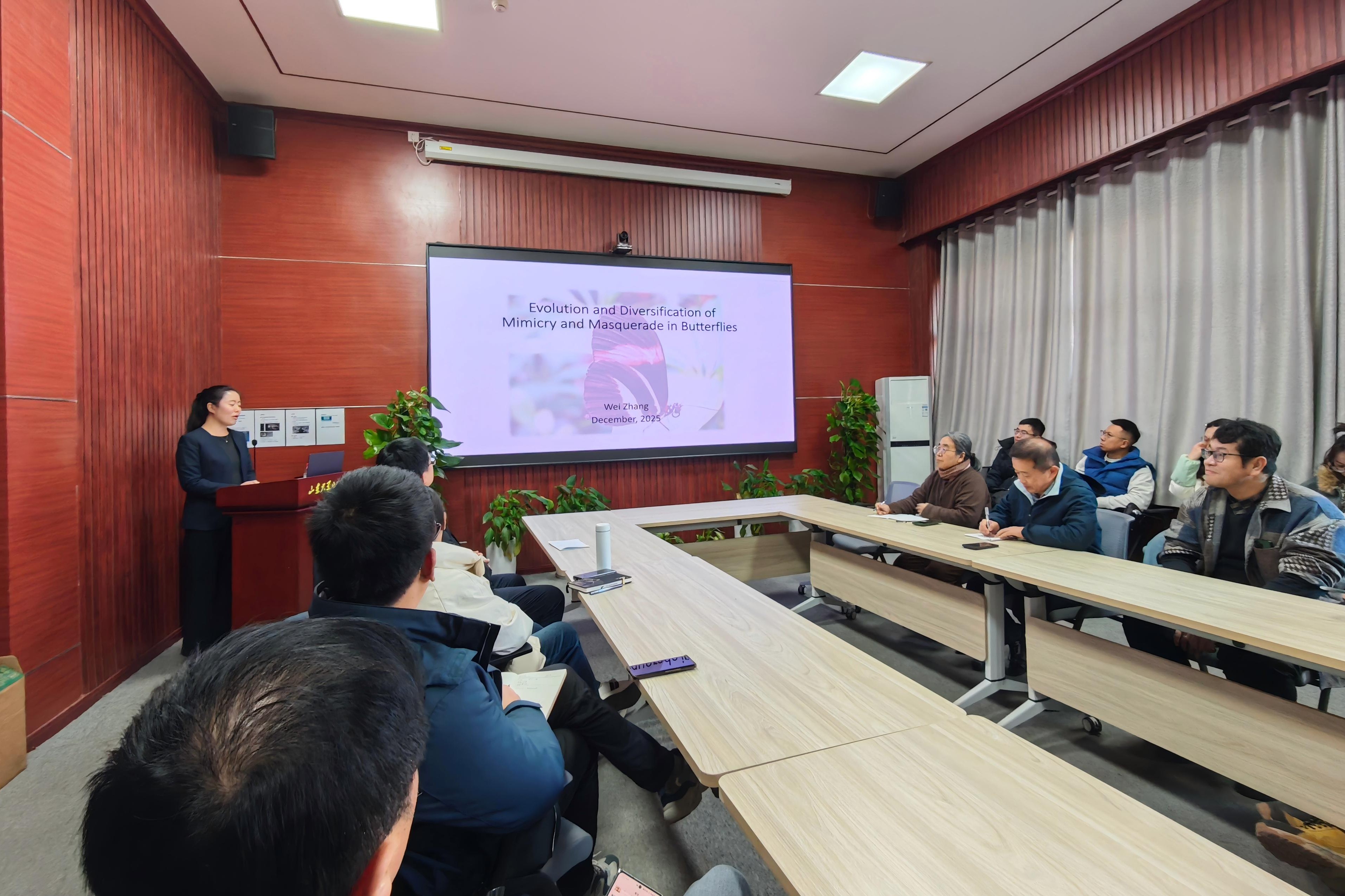 张蔚教授系统介绍了枯叶蛱蝶的翅花纹离散形态、分子形成机制和起源与演化规律,并以蛱蝶科袖蝶属为例,讲述了昆虫的物种形成和适应性辐射特征,以及生物在自然选择的定向作用下如何实现生存与繁衍之间的权衡。张蔚教授还分享了利用部分蝴蝶对马兜铃酸的毒素抑制特性,开展针对化学诱变和氧化损伤相关药物研发的工作。报告通过翔实案例与数据,呈现出昆虫演化策略的多样性,并展现了基础研究与产业应用结合的实践路径。与会师生与张蔚教授展开深入交流研讨,激发了师生们的科研热情。