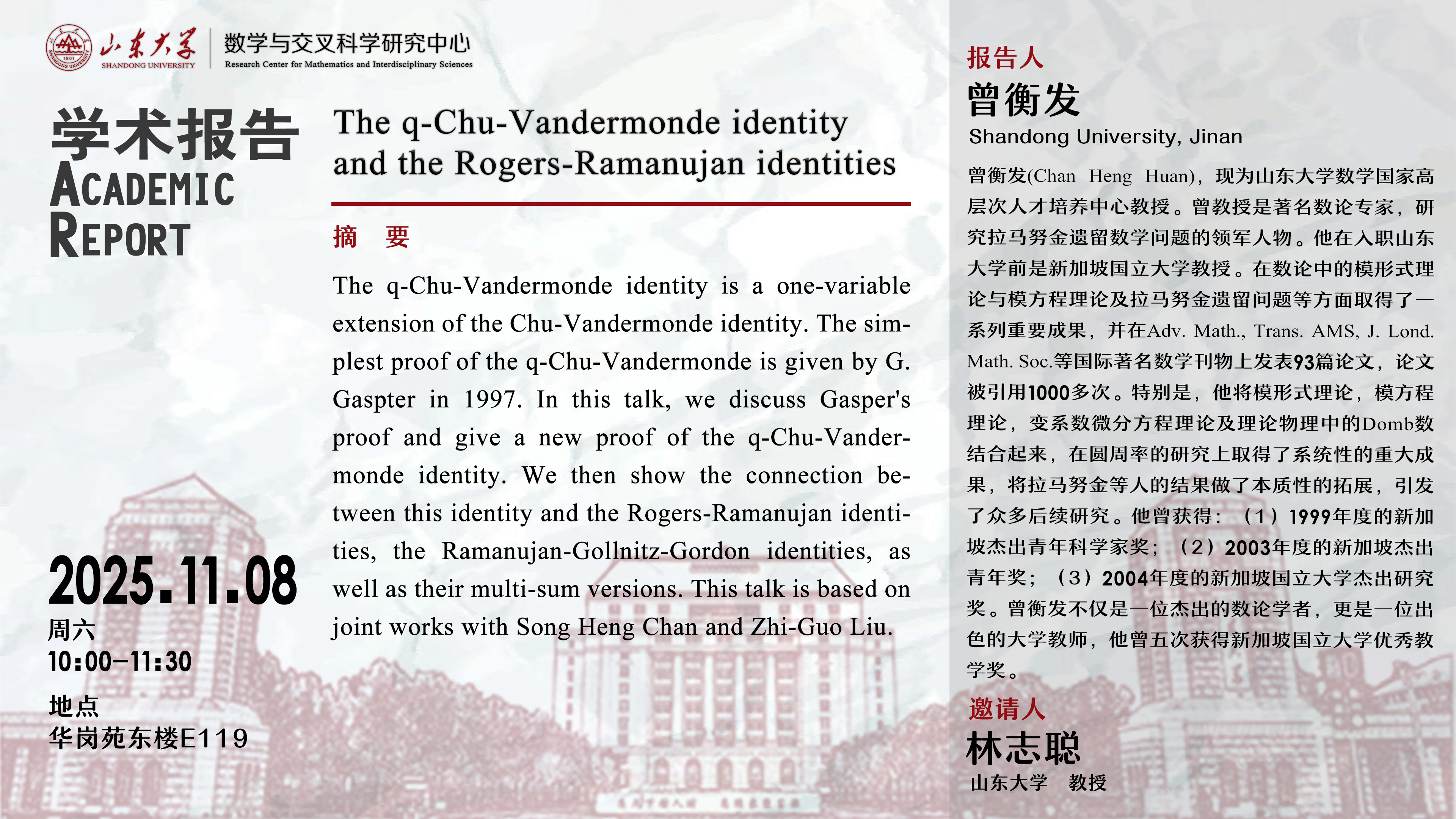 【讲座预告】The q-Chu-Vandermonde identity and the Rogers-Ramanujan identities