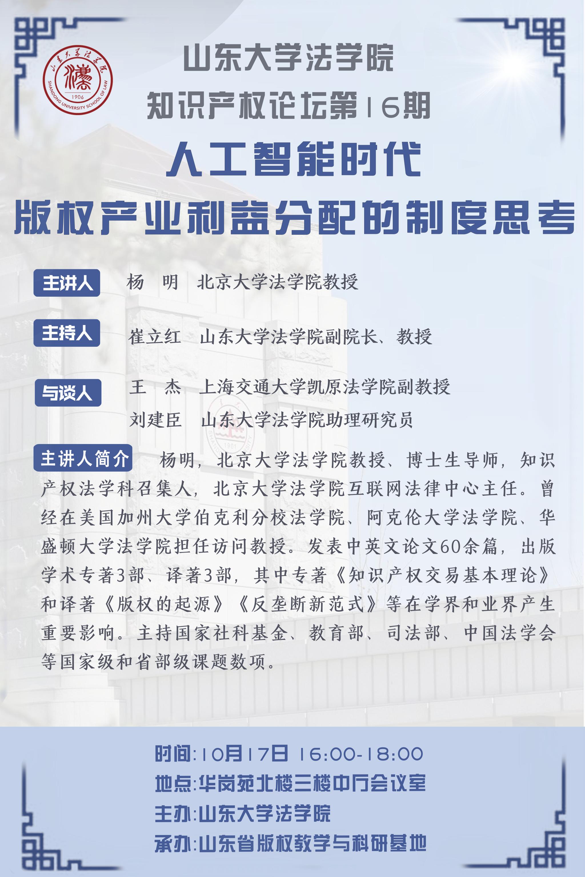 【讲座预告】山东大学法学院知识产权论坛第16期:人工智能时代版权产业利益分配的制度思考