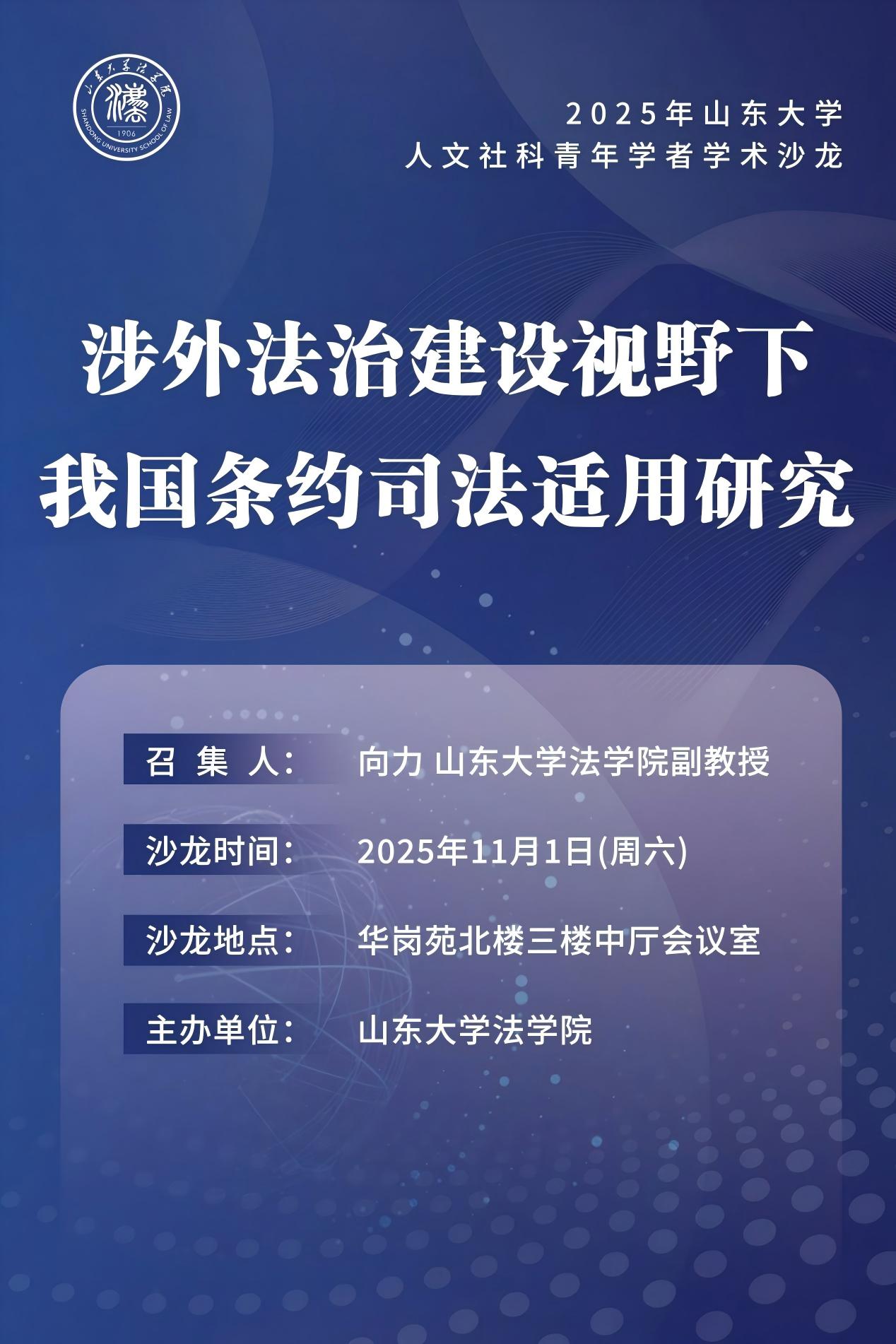 2025年山东大学人文社科青年学者学术沙龙将于2025年11月1日(周六)在山东青岛召开,本次活动由山东大学法学院主办、山东大学人文社会科学青年学者学术沙龙资助。