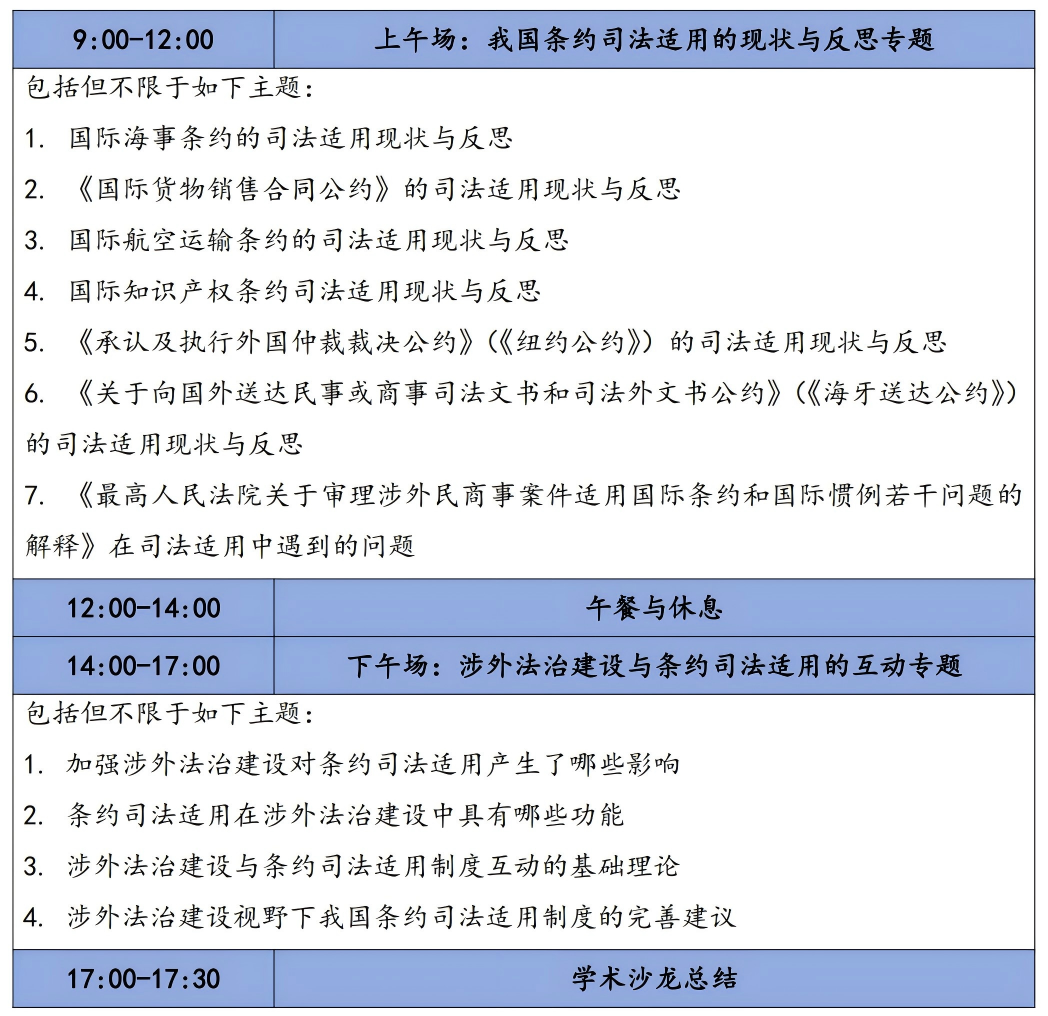 本次学术沙龙的主题是“涉外法治建设视野下我国条约司法适用研究”,分上、下午两场开展深度研讨,上午场为“我国条约司法适用的现状与反思专题”,下午场为“涉外法治建设与条约司法适用的互动专题”,每场设置“主题发言+自由交流与谈”环节。本次学术沙龙旨在通过专题研讨、自由交流等形式,共话条约司法适用前沿问题,凝聚学界智慧,助力我国涉外法治建设与条约司法适用制度优化。