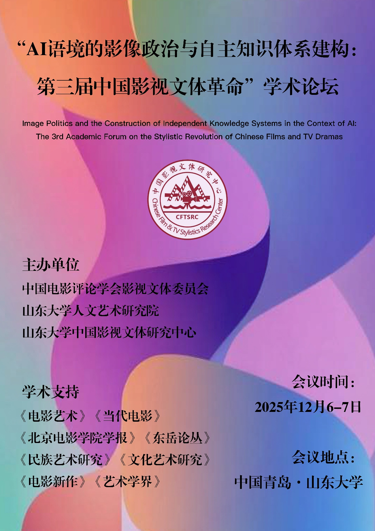 2025年12月6日至7日,由中国电影评论学会影视文体委员会、山东大学人文艺术研究院、山东大学中国影视文体研究中心联合主办,《电影艺术》《当代电影》等多家权威学术期刊提供学术支持的“AI语境的影像政治与自主知识体系建构:第三届中国影视文体革命”学术论坛,将在山东青岛校区隆重召开。这场汇聚影视学界顶尖力量的学术盛会,将以跨学科视野聚焦AI时代影视文体的变革与发展,为中国影视自主知识体系建构注入新动能。