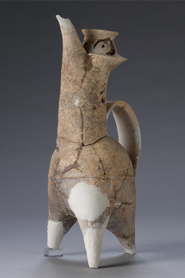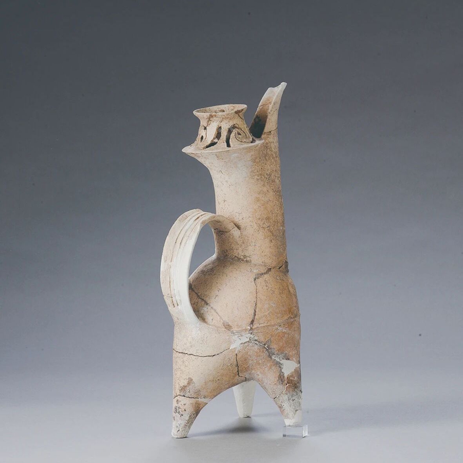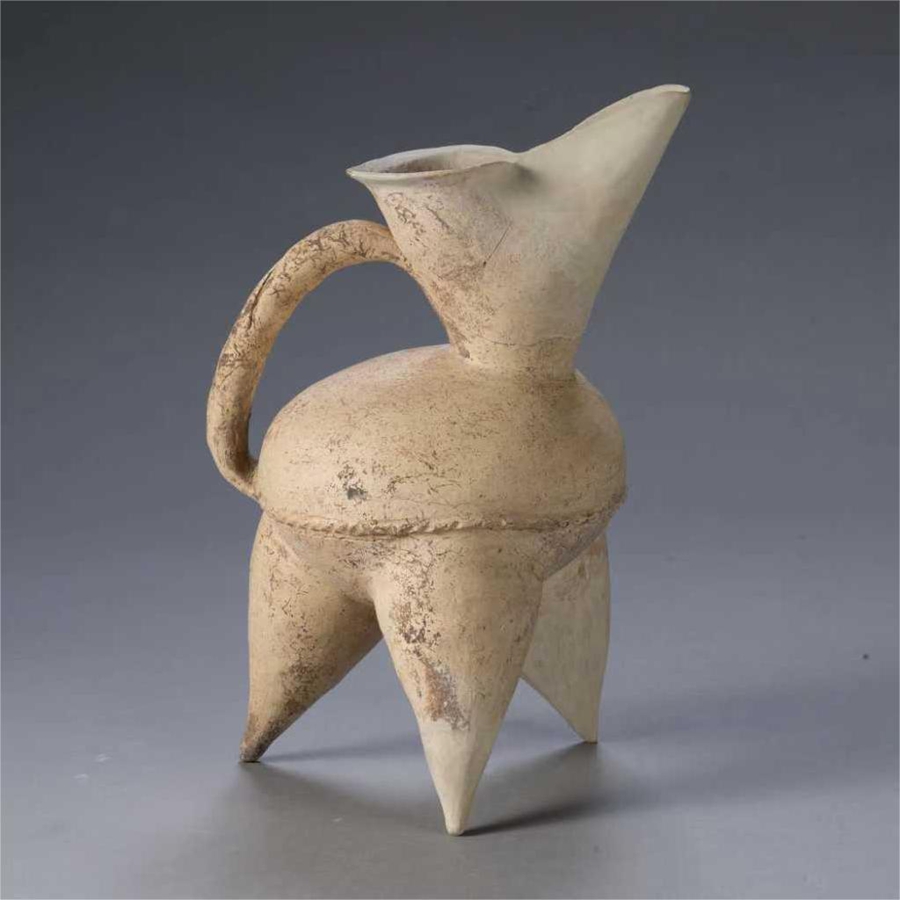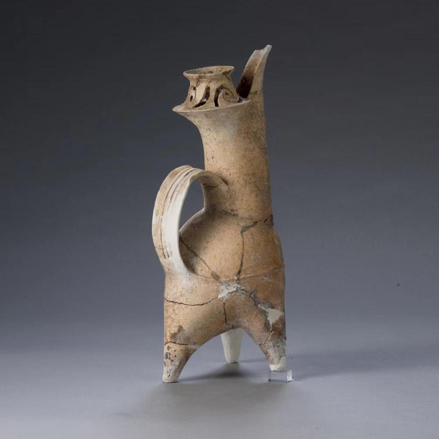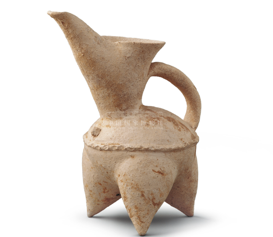 现藏于山东大学博物馆的大汶口文化时期的白陶鬹,造型为似鸟、长流、束颈、袋足。