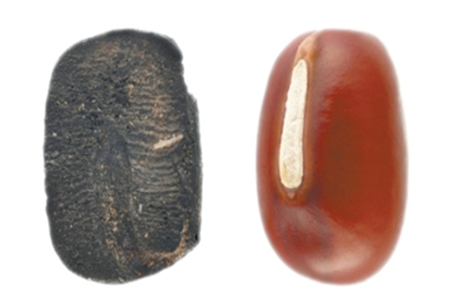 小高遗址出土的炭化小豆(左)与现代小豆(右)。