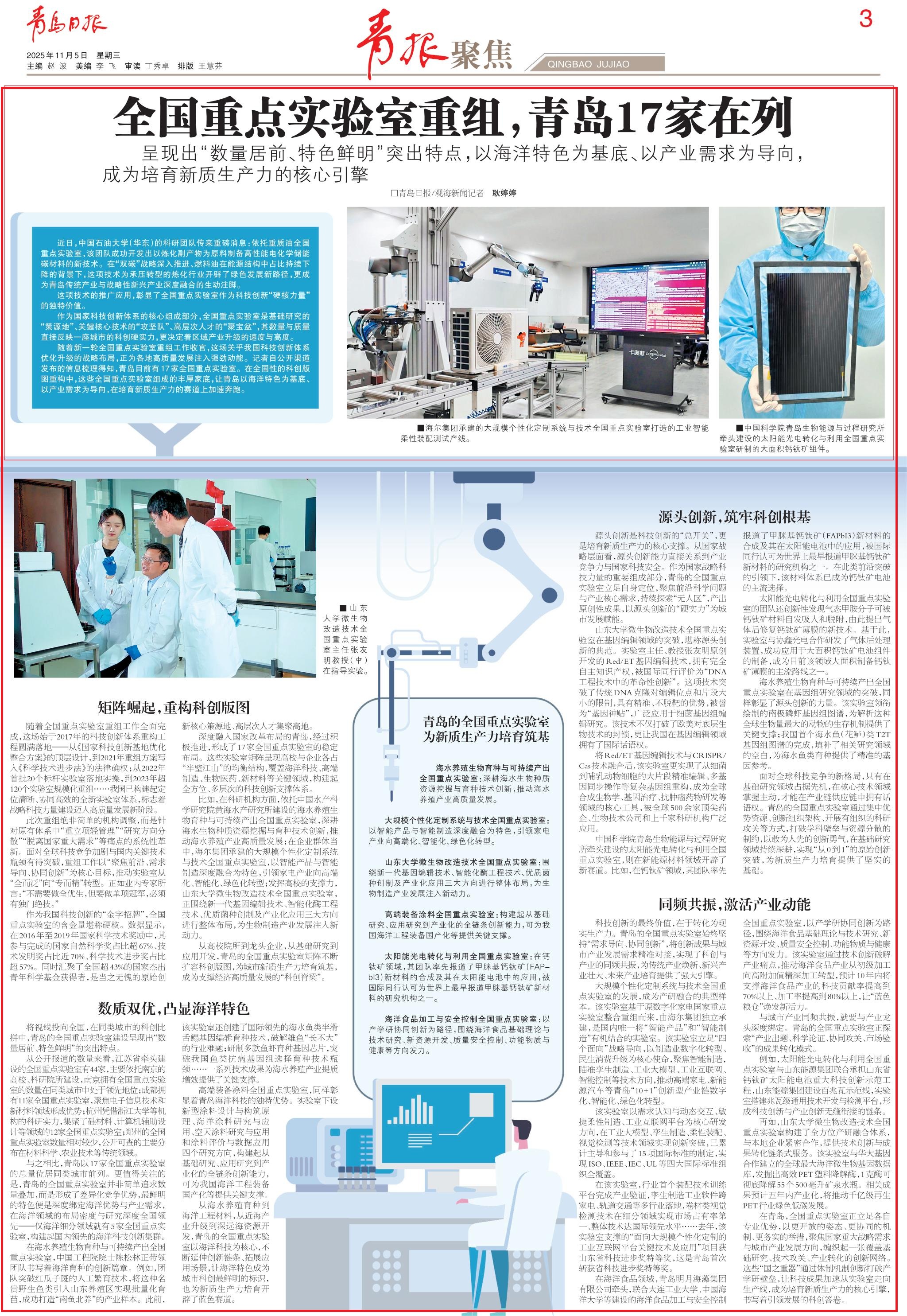 从海水养殖育种到海洋工程材料,从近海产业升级到深远海资源开发,青岛的全国重点实验室以海洋科技为核心,不断延伸创新链条、拓展应用场景,让海洋特色成为城市科创最鲜明的标识,也为新质生产力培育开辟了蓝色赛道。