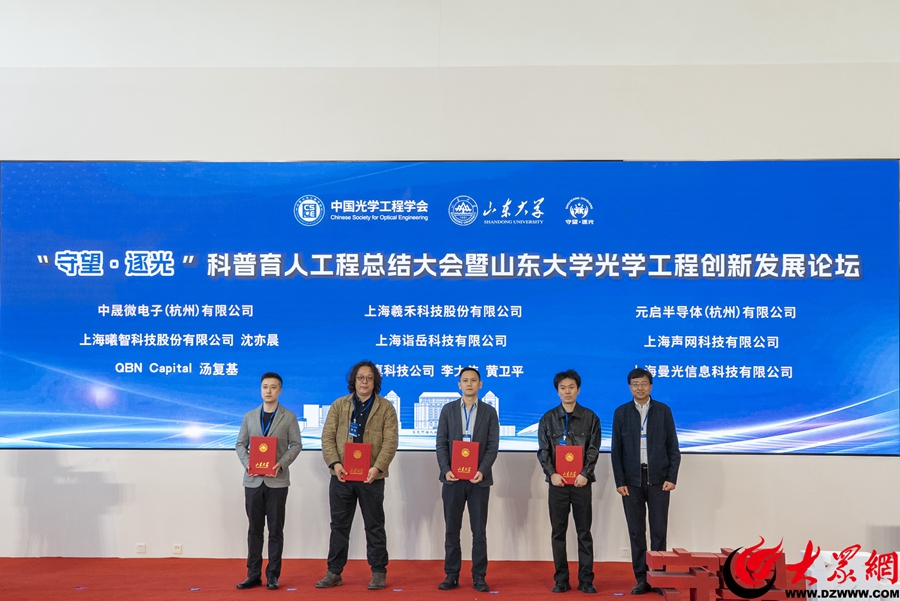 4月19日,“守望・逐光”科普育人工程总结大会暨山东大学光学工程创新发展论坛在青岛校区举行。中国工程院院士、长春理工大学教授姜会林,中国工程院院士、中科院光电技术研究所所长、中国光学工程学会副理事长罗先刚,山东大学校长、中国工程院院士李术才,民政部儿童福利司二级巡视员李多文出席会议。